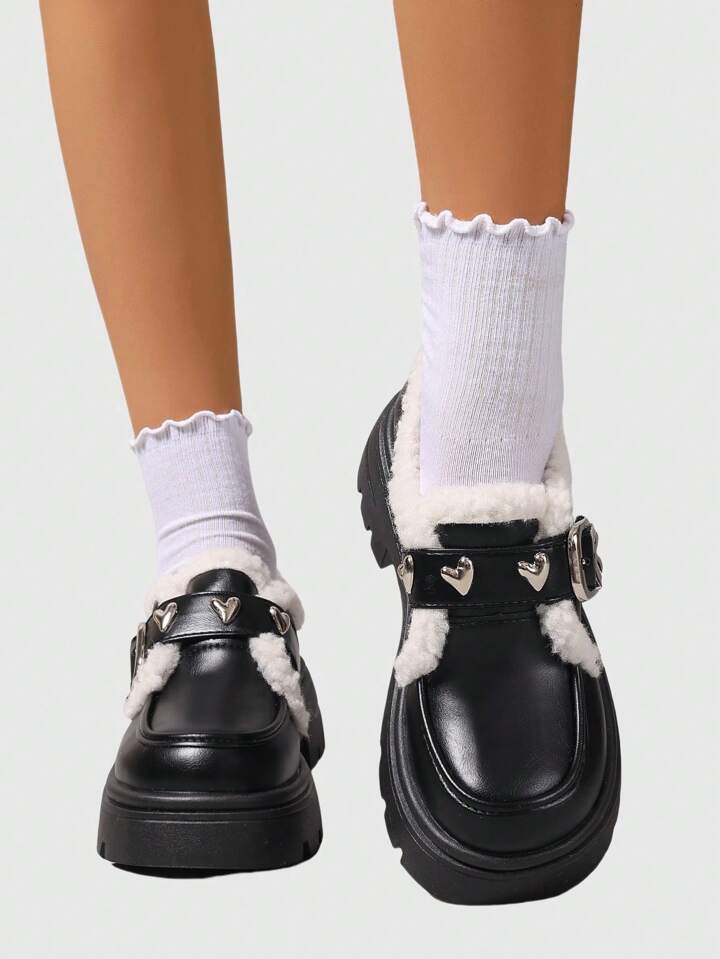 Kawaii Dark Punk Metal Heart & Butterfly Buckle Fashion Versatile Japanese Style White Fluffy Trim Snow Boots, Warm & Thick Sole, Thermal Lined For Winter For Christmas And New Year Holiday Vibe Fall And Winter