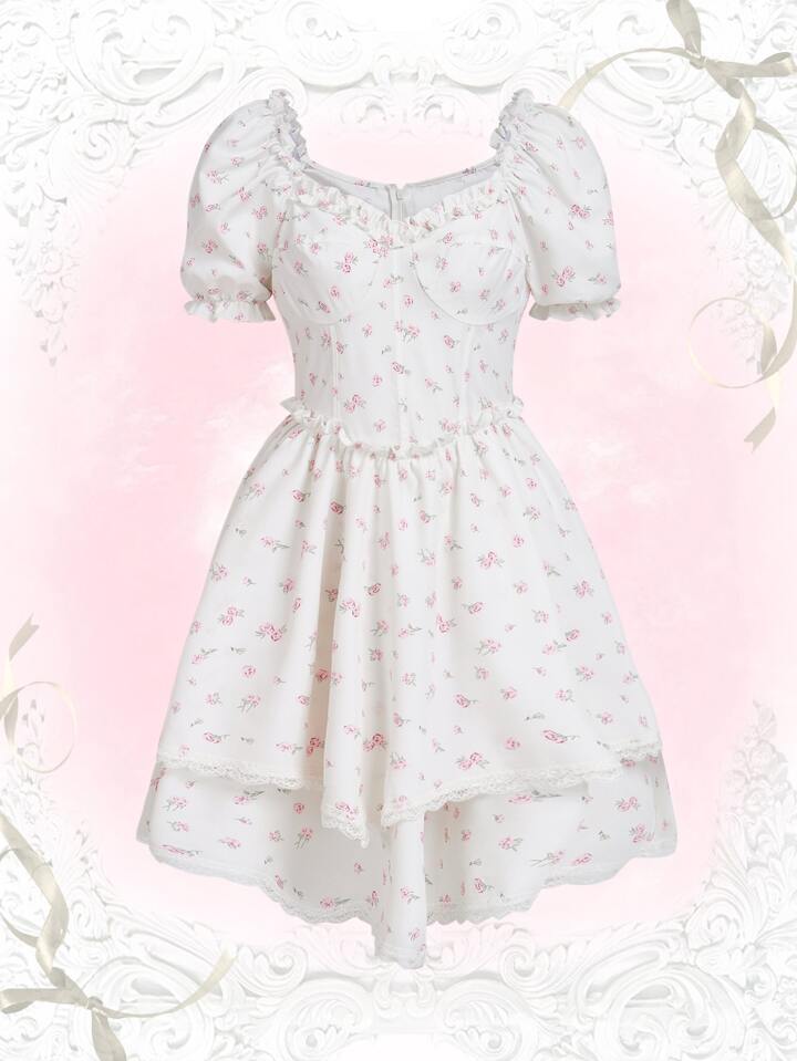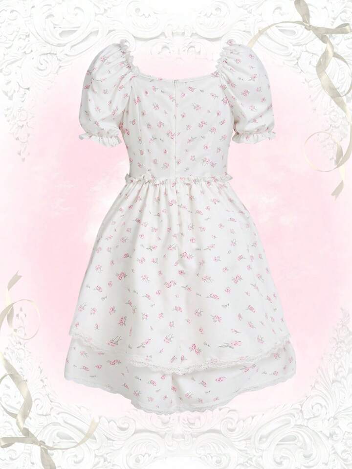 Kawaii Ditsy Floral Print Frill Trim Puff Sleeve Dress