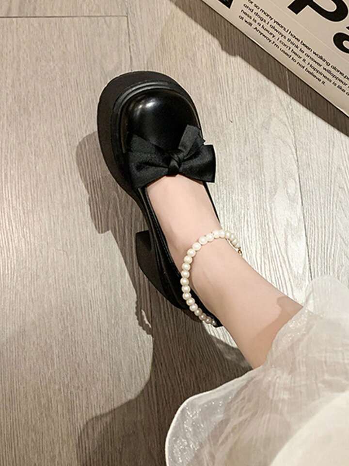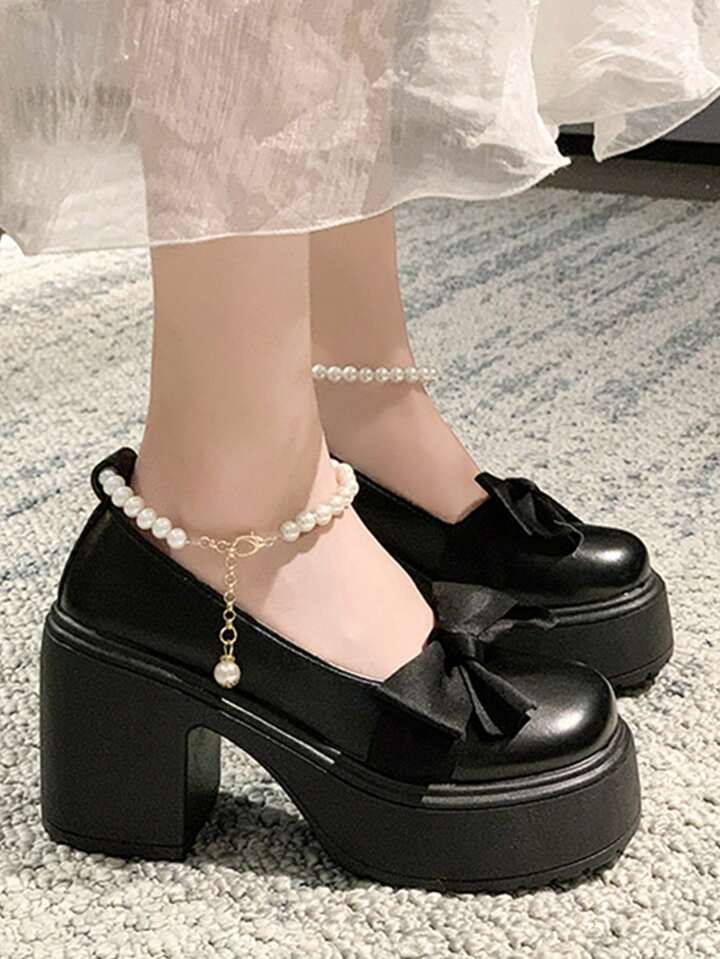 Kawaii Fashionable Ankle Strap Court Wedges For Women, Bow & Faux Pearl Decor Wedges Shoes