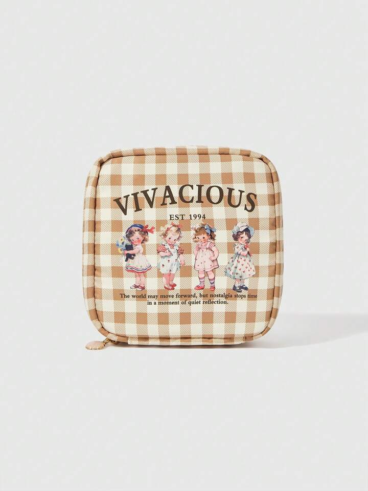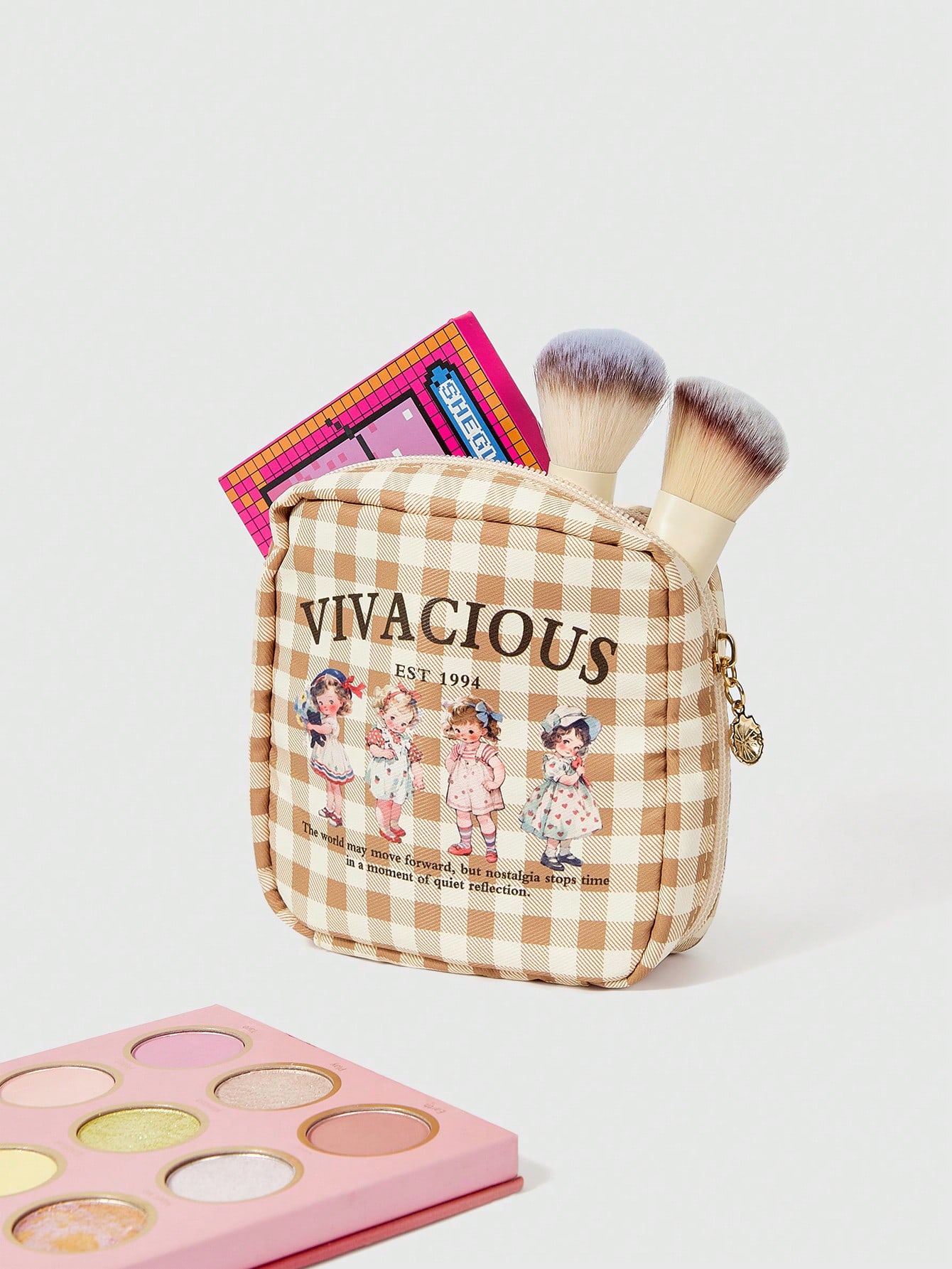 Kawaii Fashionable Cartoon American Girl Thick Padded Large Capacity Portable Cosmetic Bag, Compact Square Design