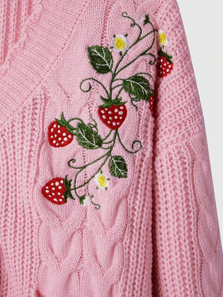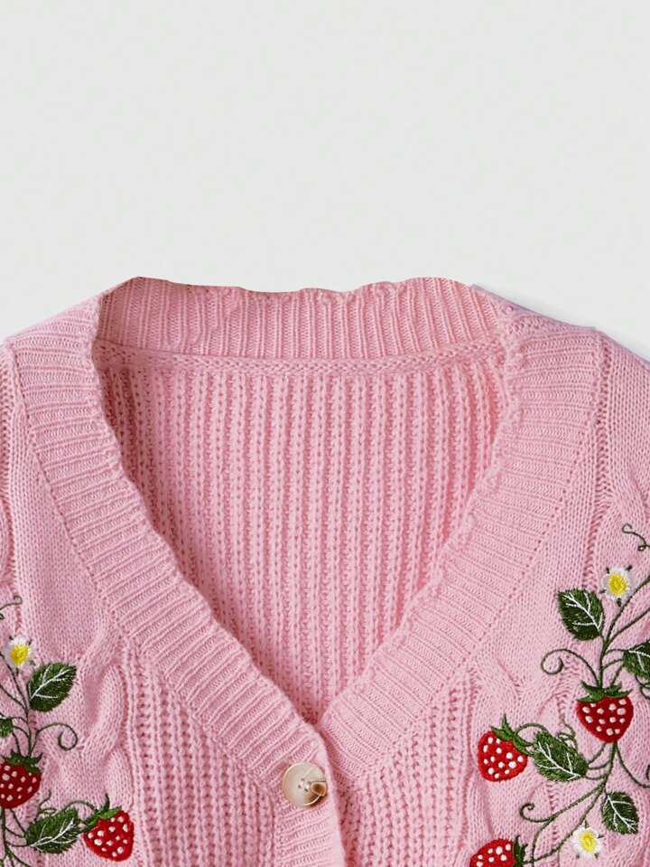 Kawaii Floral Embroidery Cable Knit Button Front Drop Shoulder Cardigan