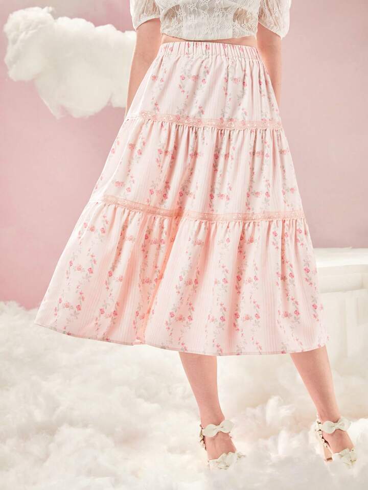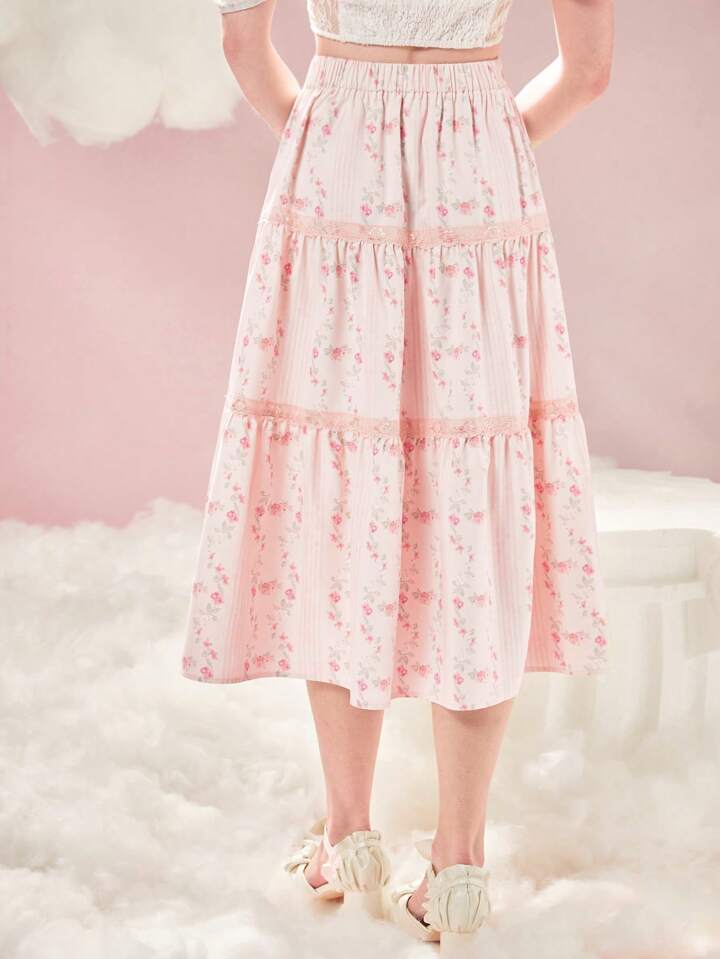 Kawaii Floral Print Contrast Lace Ruffle Hem Skirt