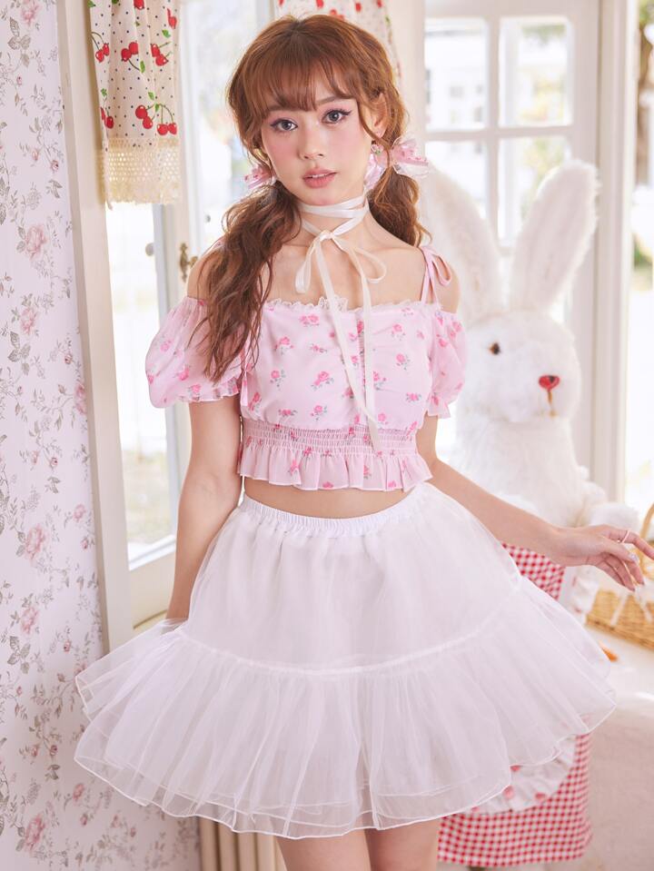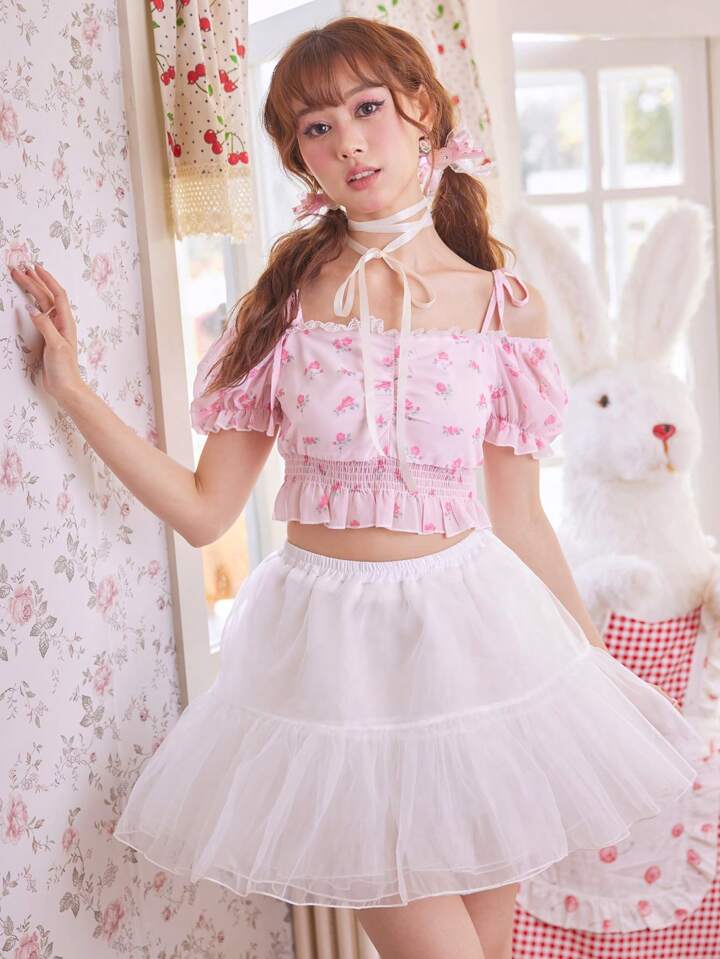 Kawaii Floral Print Ruffle Hem Crop Blouse