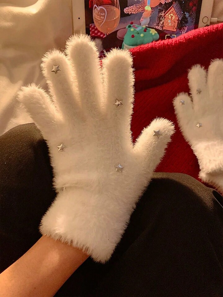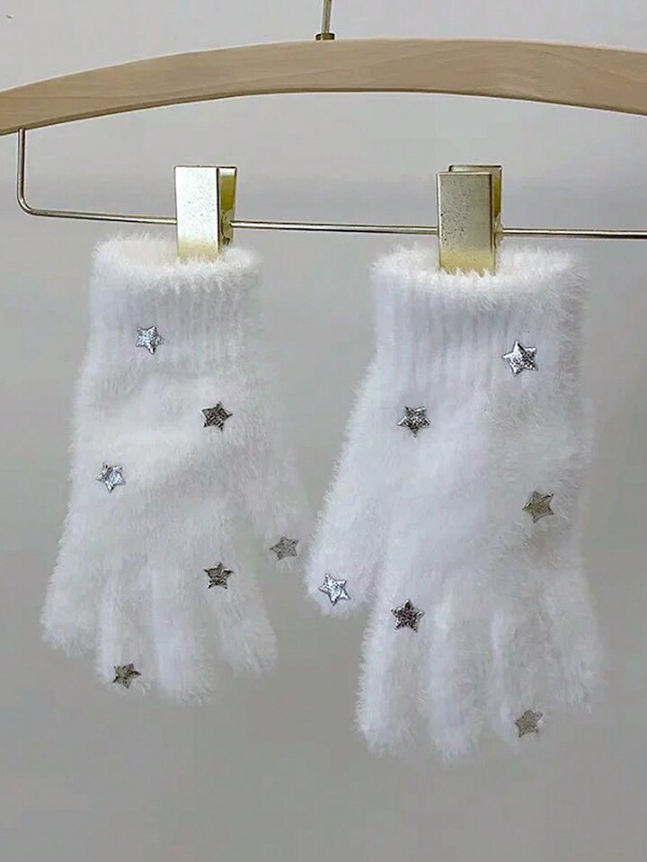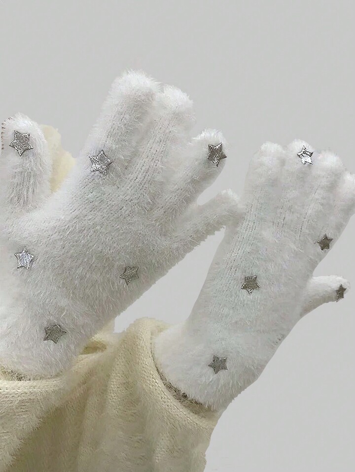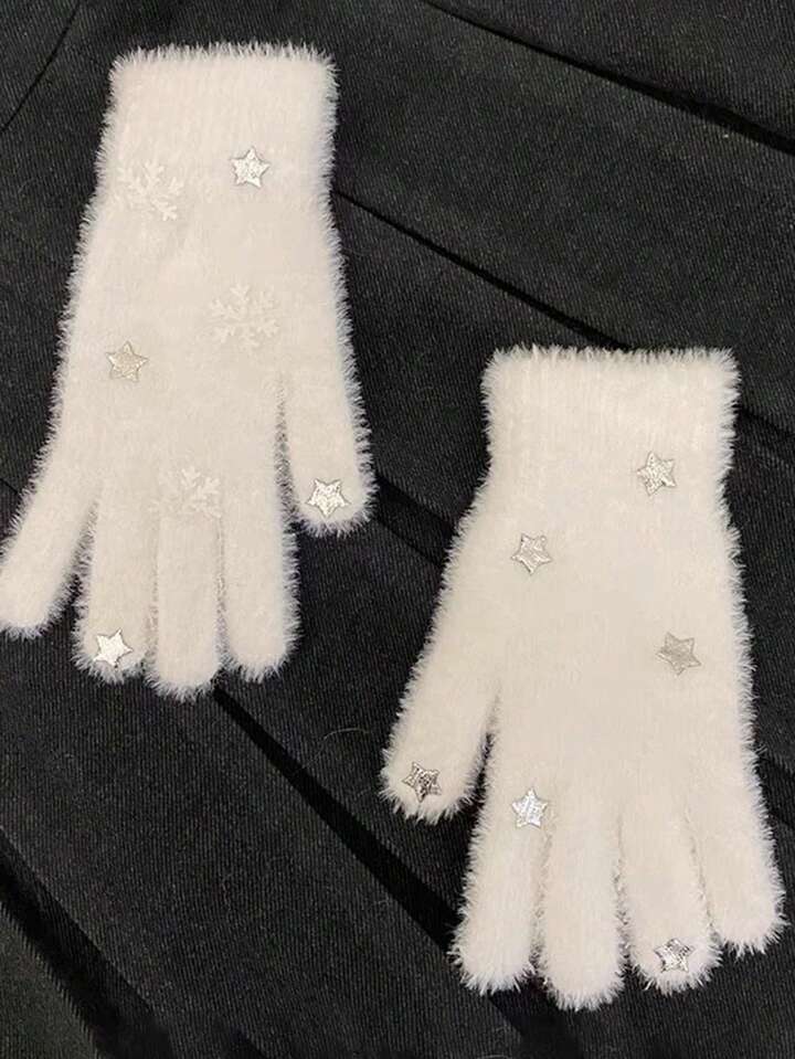 Kawaii Fluffy Thick Star Design Women's Gloves In White