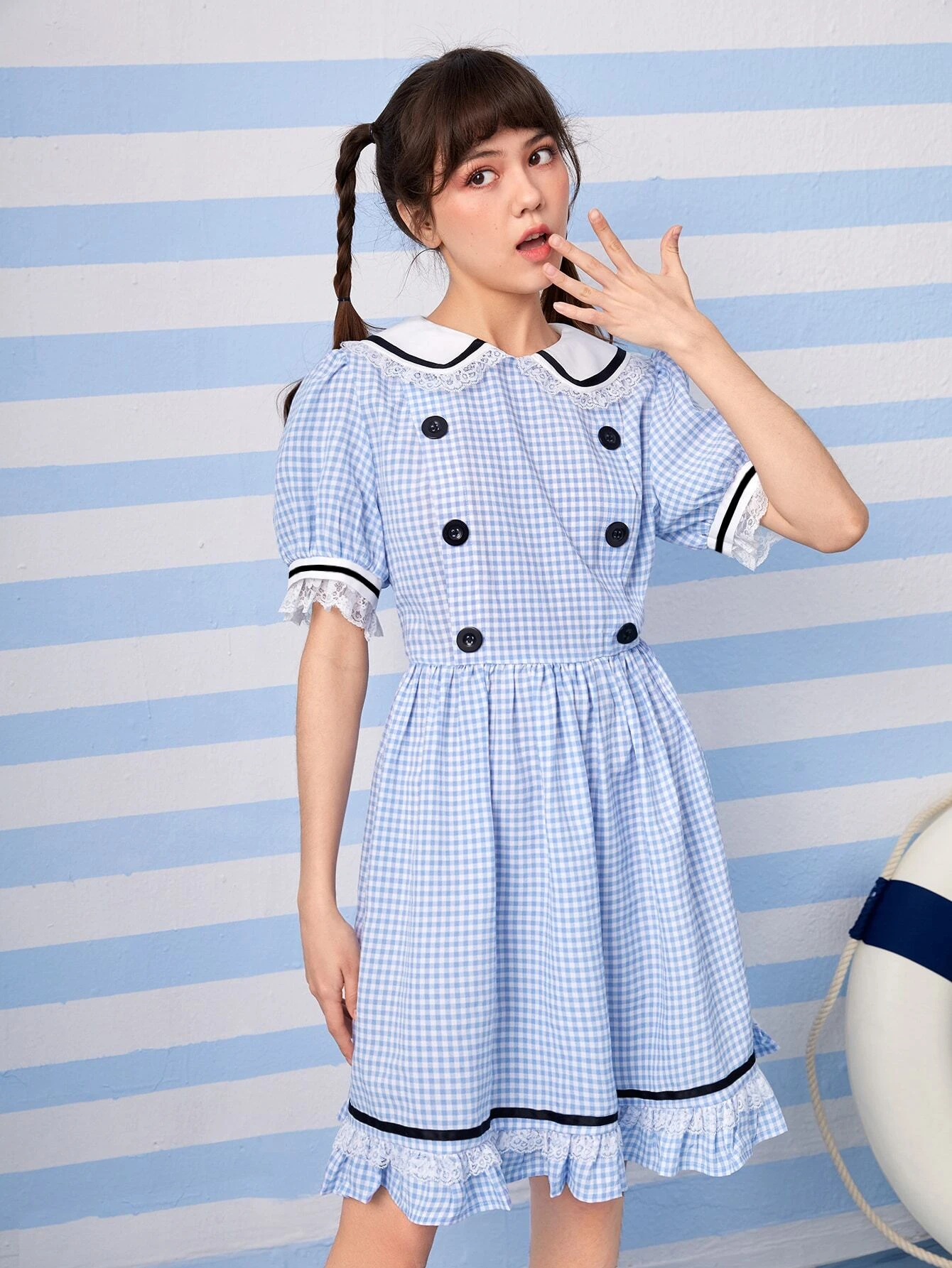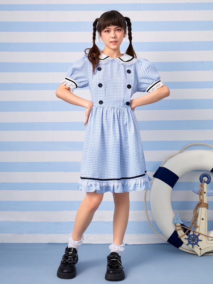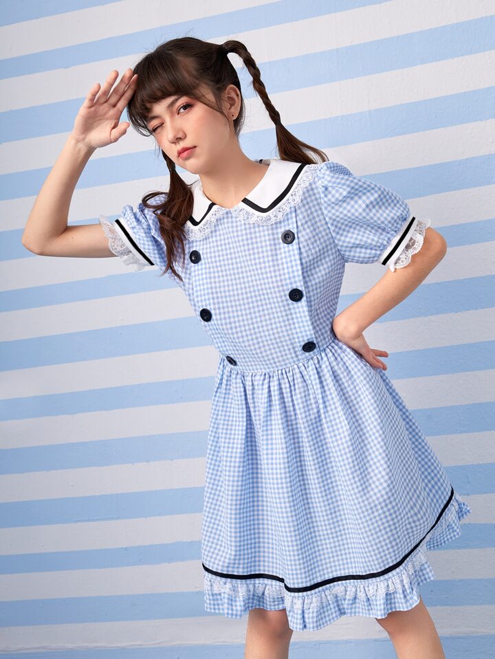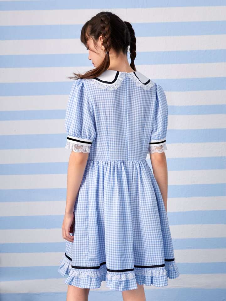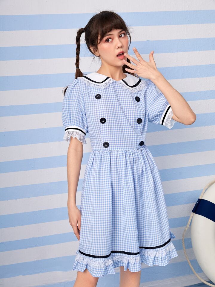 Kawaii Gingham Print Contrast Binding Ruffle Hem Dress