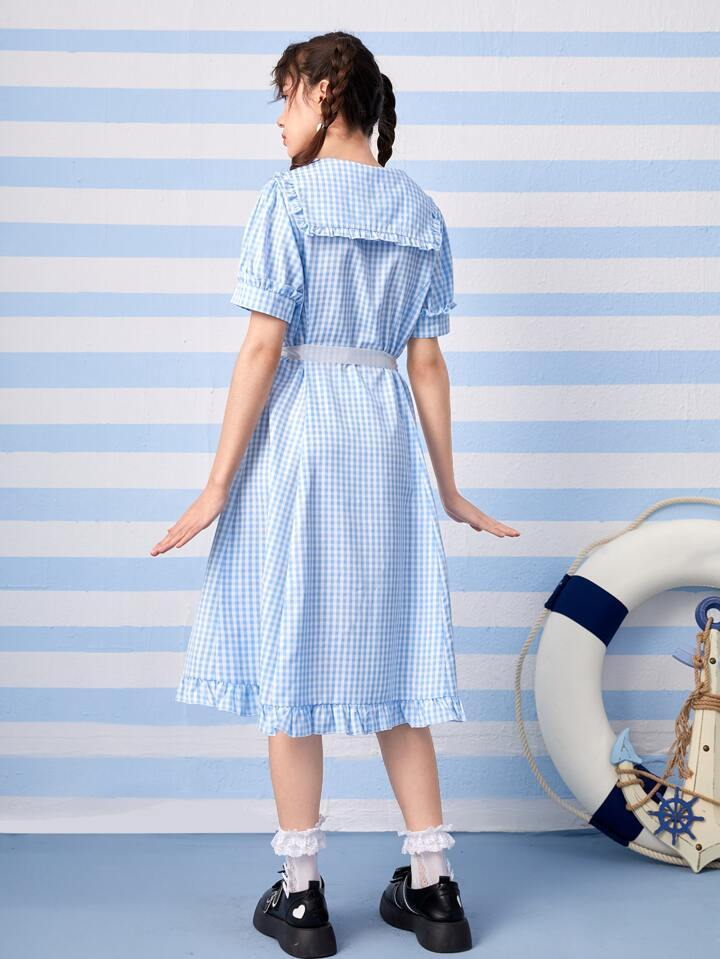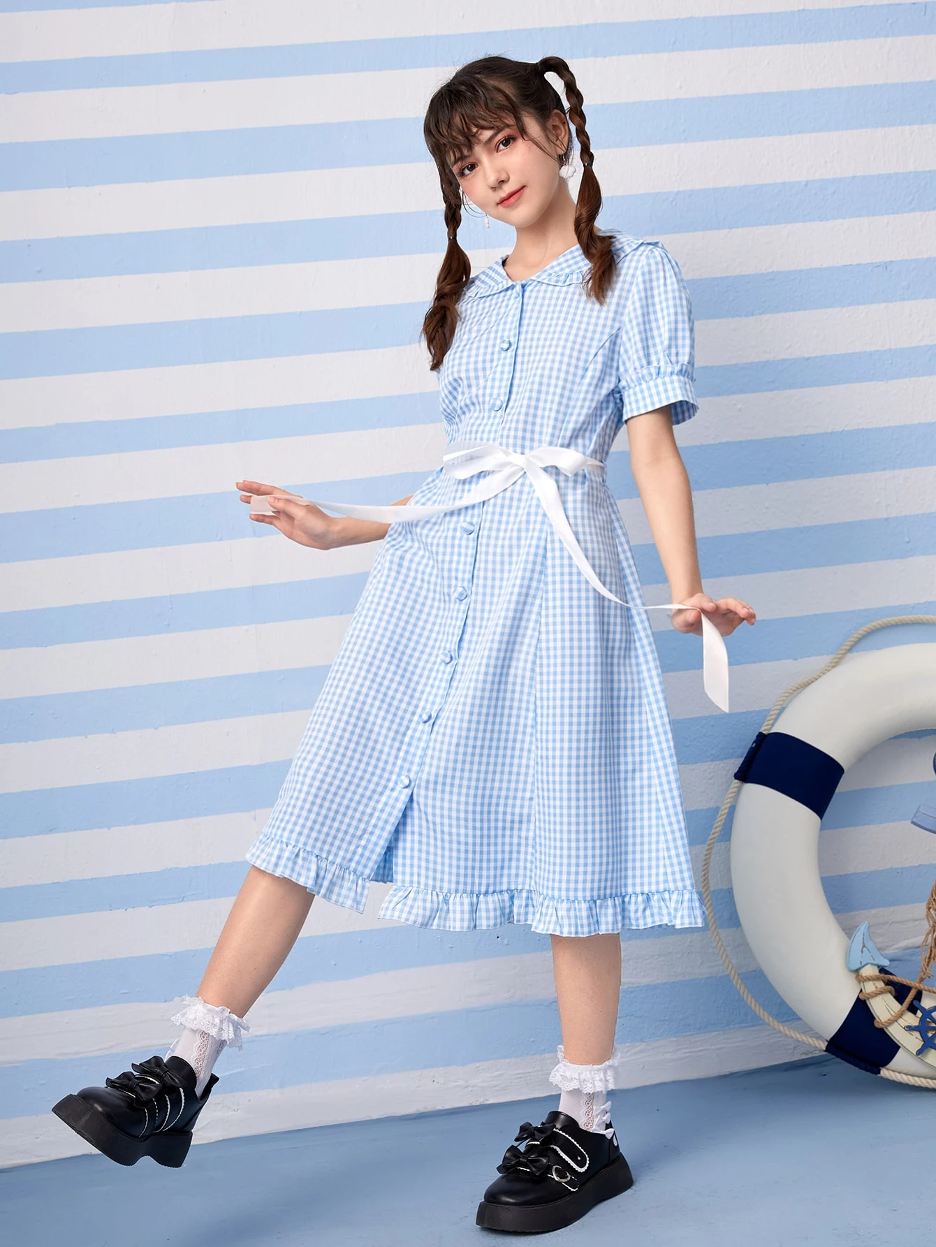 Kawaii Gingham Print Puff Sleeve Ruffle Hem Belted Shirt Dress