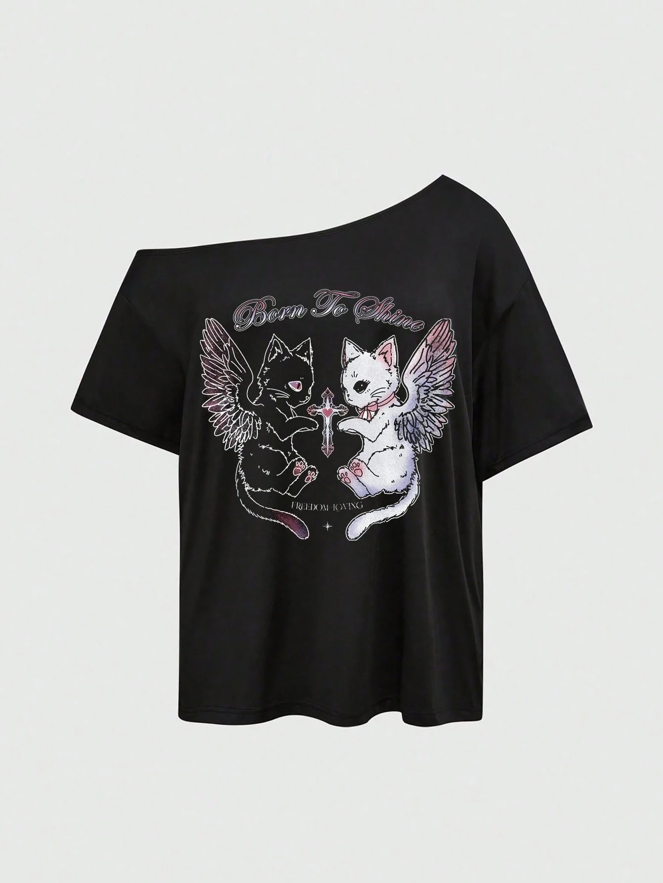 Kawaii Gothic Mysterious Cat Cross Print Heart Sexy Asymmetric Shoulder Black Solid Basic Summer Breezy Street Style Vintage Plus Size Asymmetric Shoulder T-Shirt Suitable For Going Out