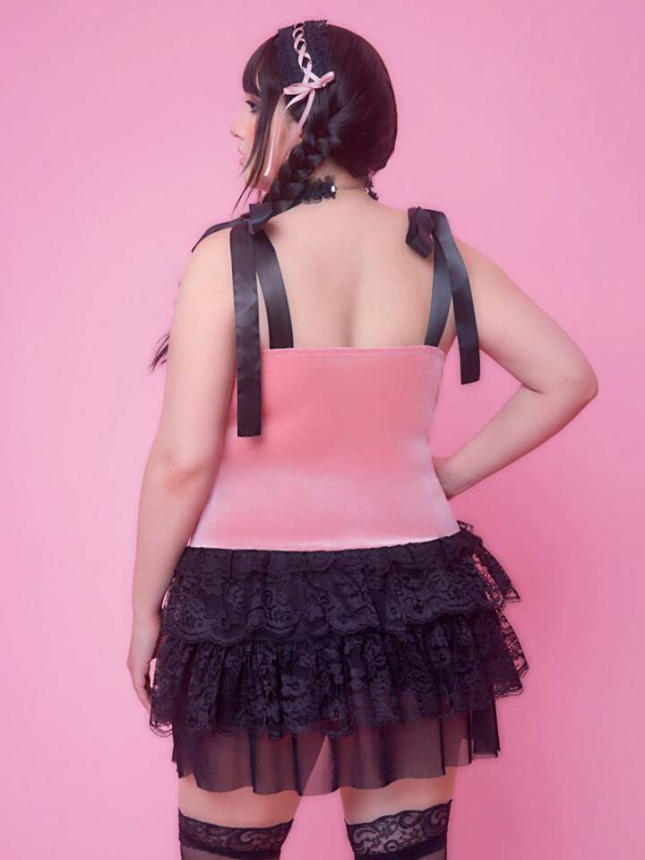 Kawaii Gothic Retro Regal Style Color Blocking Lace Trim Cross Strap Velvet Plus Size Slip Dress For Women