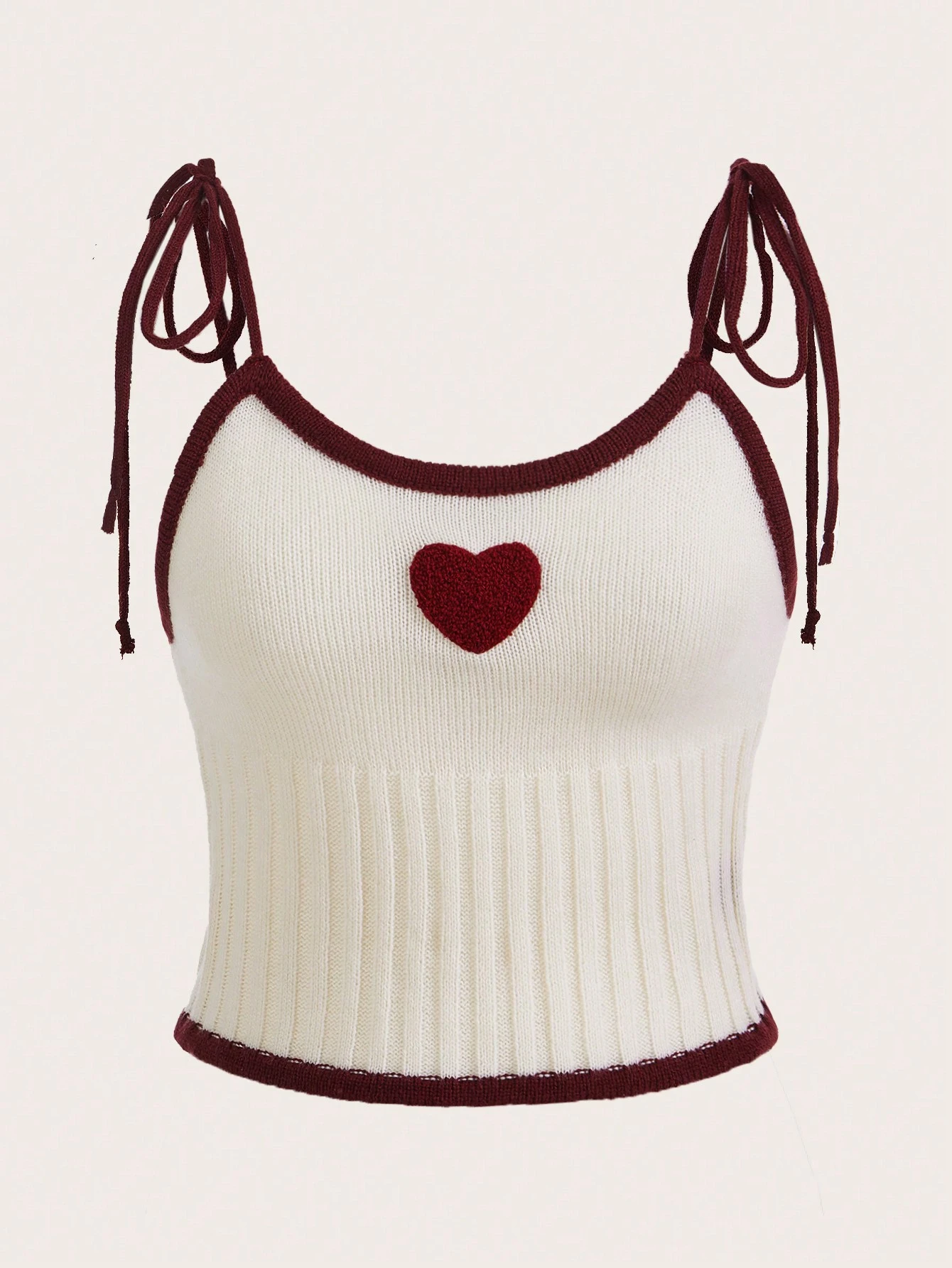 Kawaii Heart Patched Tie Shoulder Contrast Binding Cami Knit Top