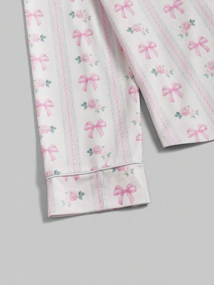 Kawaii Himekaji Bowknot Print Long Sleeve Shirt And Pants Pajama Set, School