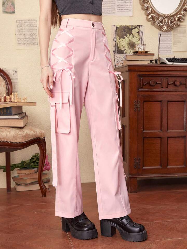 Kawaii Lace Up Side Flap Pocket Wide Leg Pants