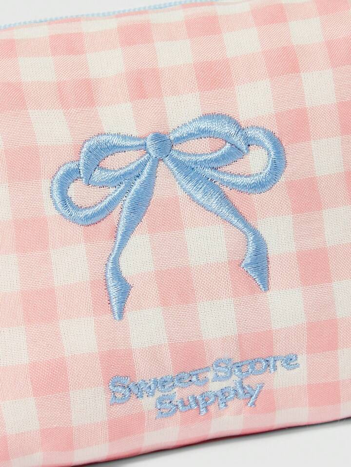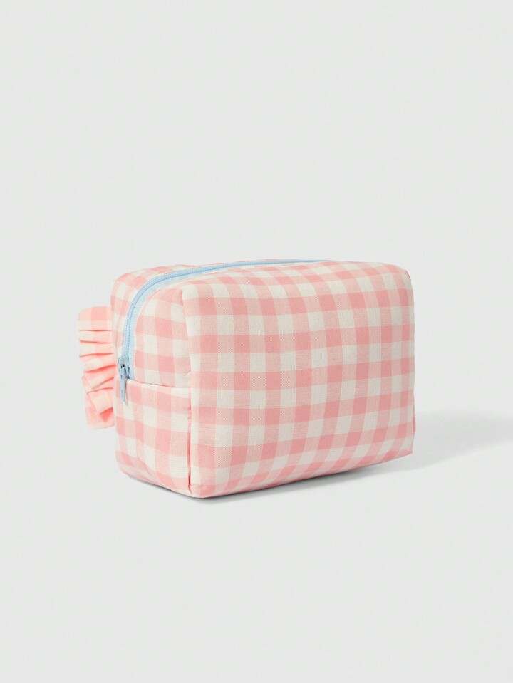 Kawaii Large Capacity Fashionable Ruffled Plaid Bow Embroidery Cosmetic Bag, Makeup Bag
