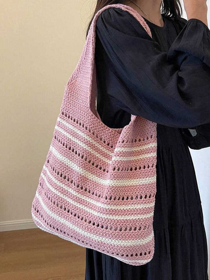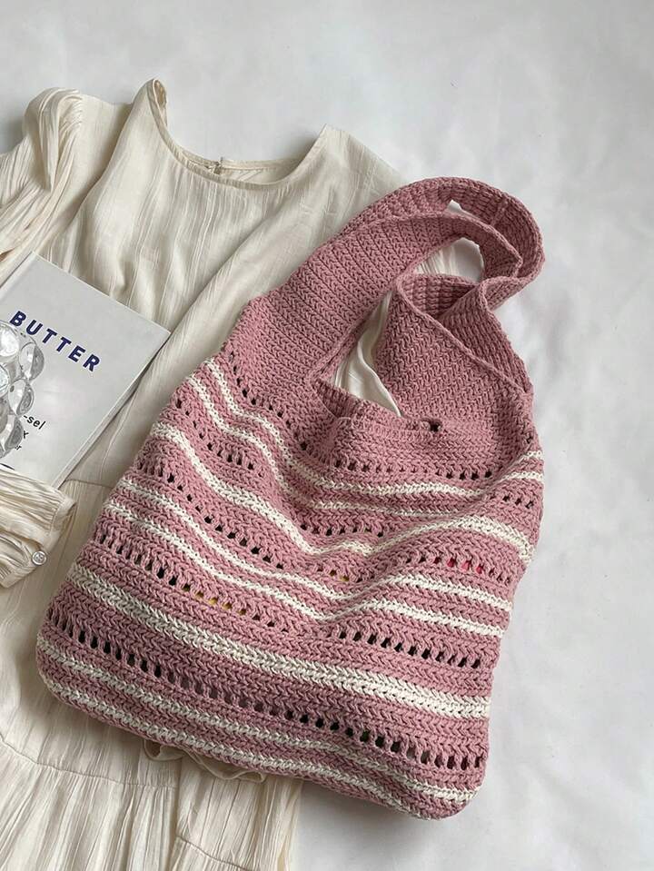 Kawaii Medium Crochet Bag Casual Striped Pattern Hollow Out For Women For Daily