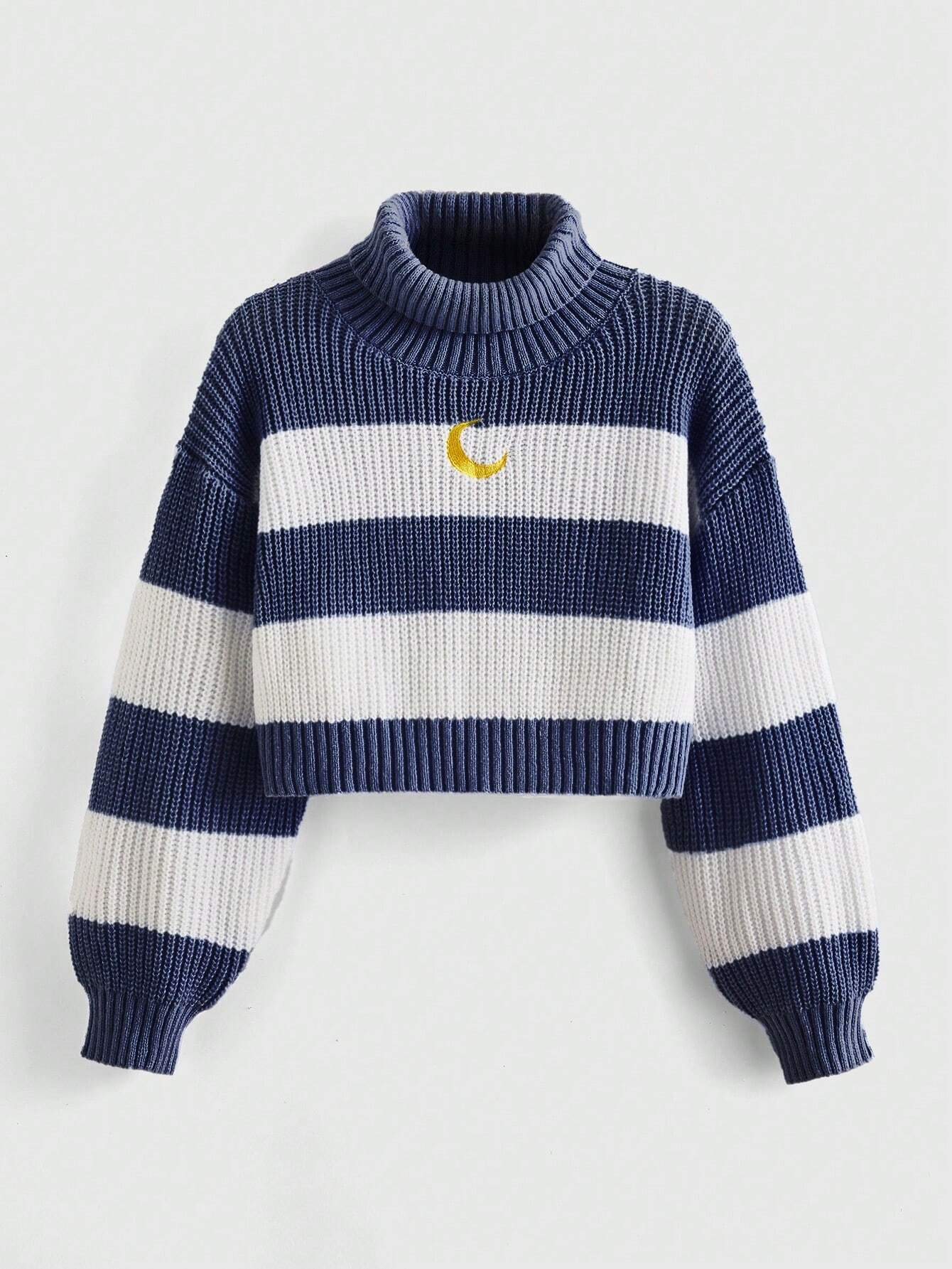 Kawaii Moon Embroidery Color-Block Crop Knit Sweater