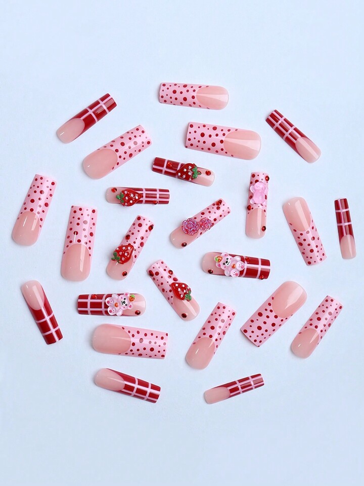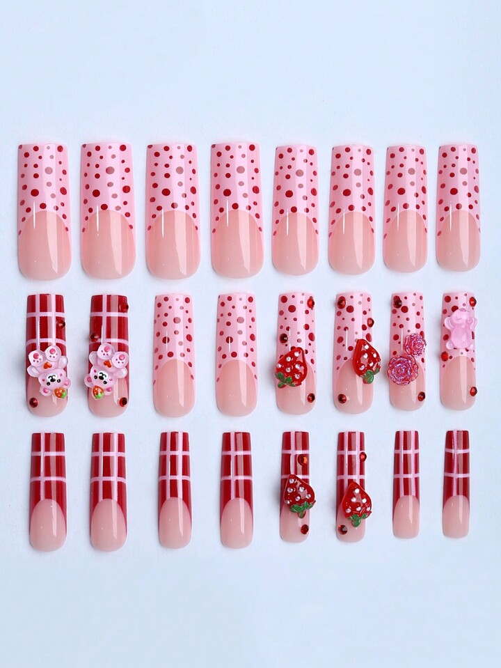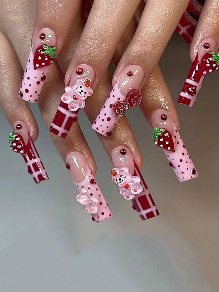Kawaii New Cute Strawberry Teddy Bear Design Red & Pink Mixed Long False Nails, Press-On Style, Suitable For Spring & Summer Nail Decor, Fake Nails