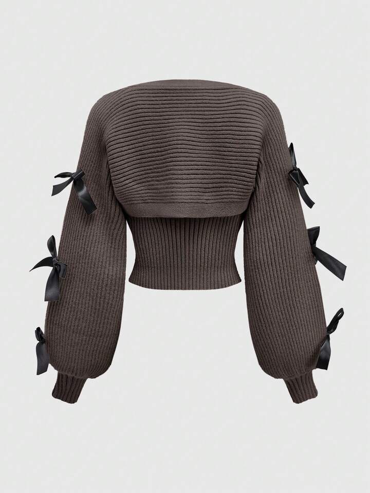 Kawaii New Year & Valentine's Day Casual Layered Cute Bow Tie Decor Women Lantern Sleeve Cover Up Shrug Vest Two Pieces Set