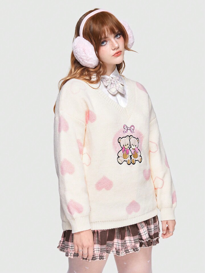 Kawaii Plus 1pc Heart & Cartoon Pattern Drop Shoulder Sweater