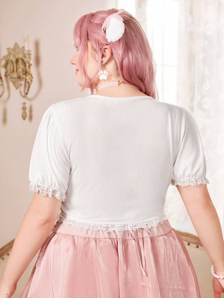 Kawaii Plus Angel Print Contrast Lace Puff Sleeve Tee
