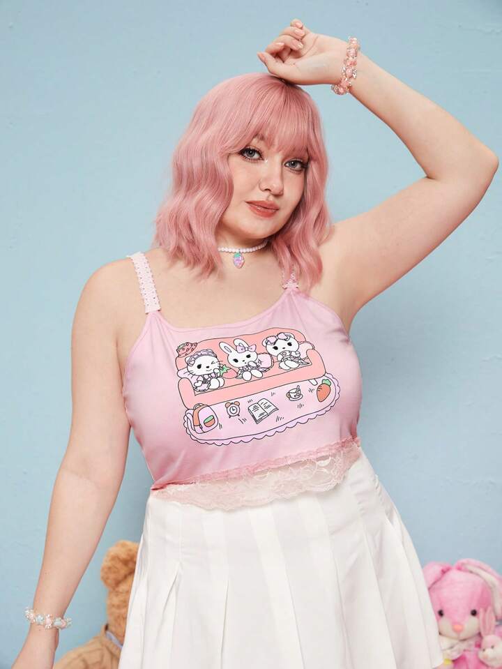 Kawaii Plus Cartoon Graphic Lace Trim Cami Top