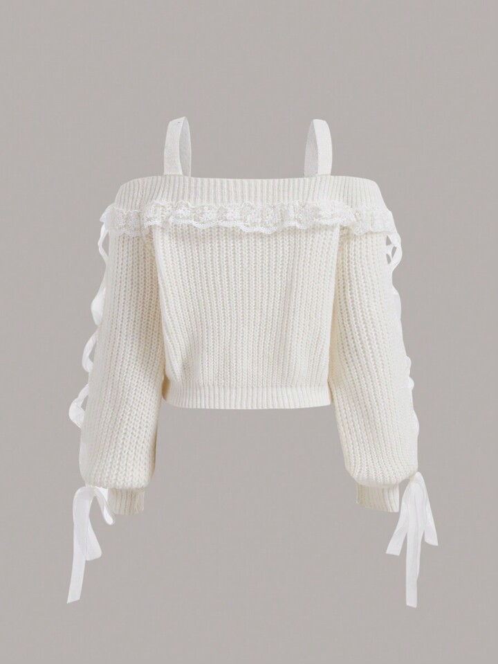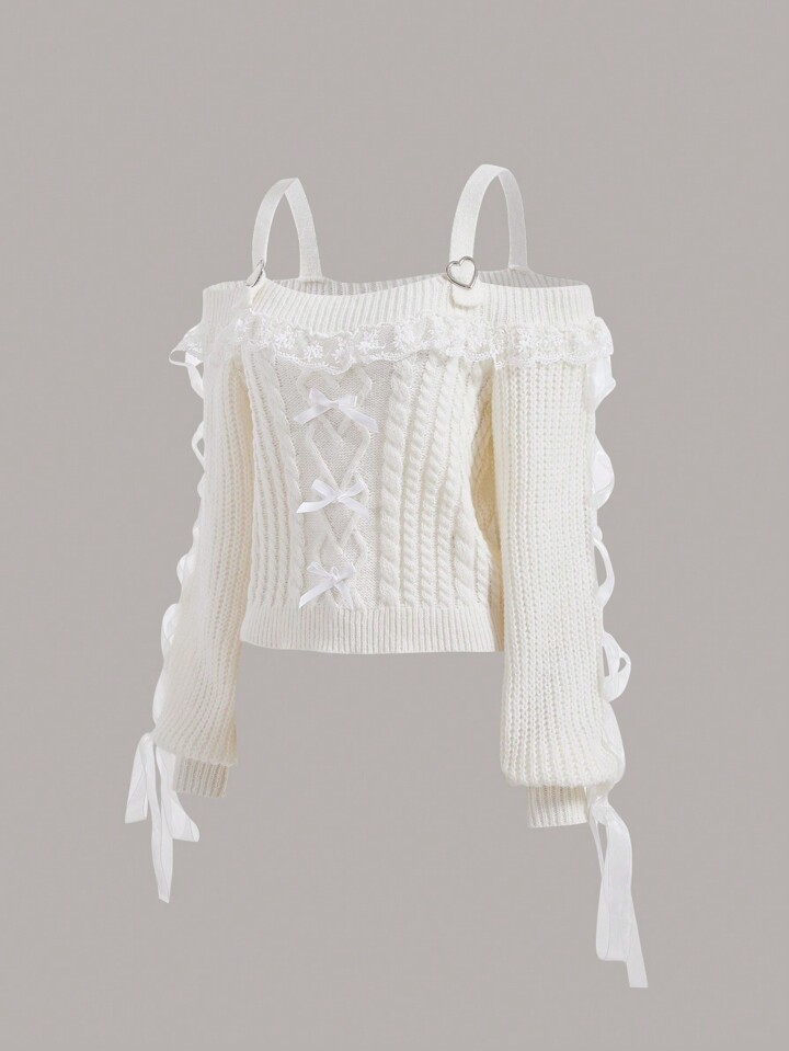 Kawaii Plus Cold Shoulder Ruffle Trim Bow Front Sweater, School