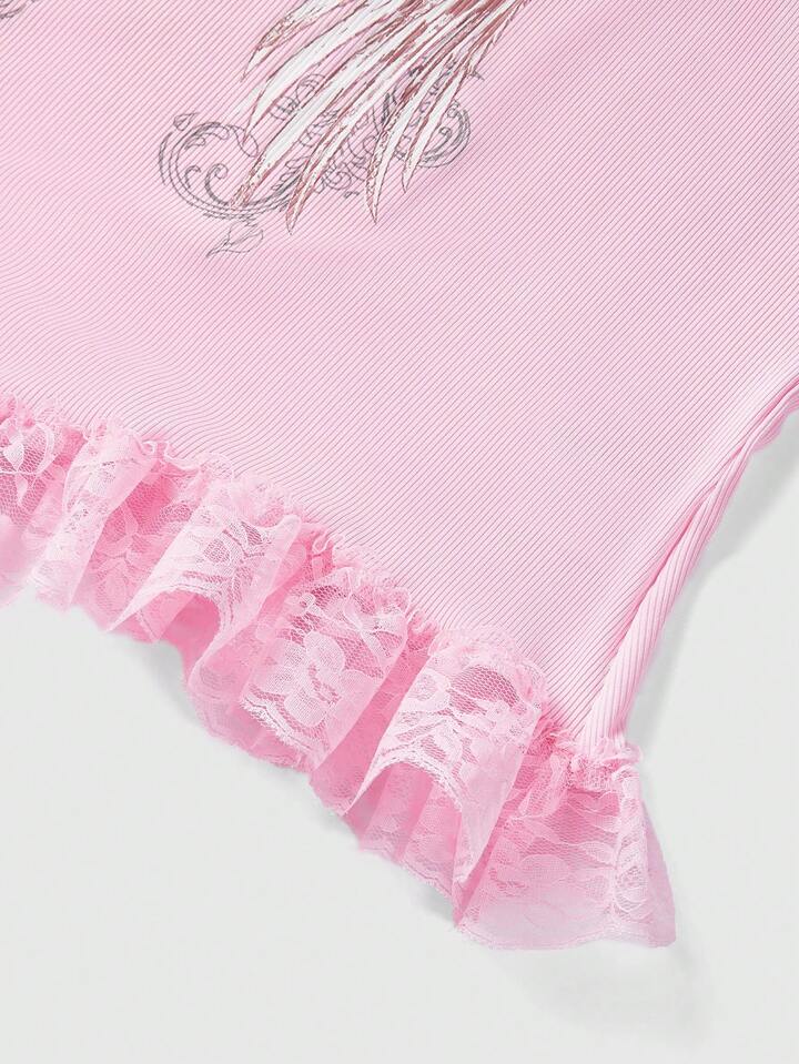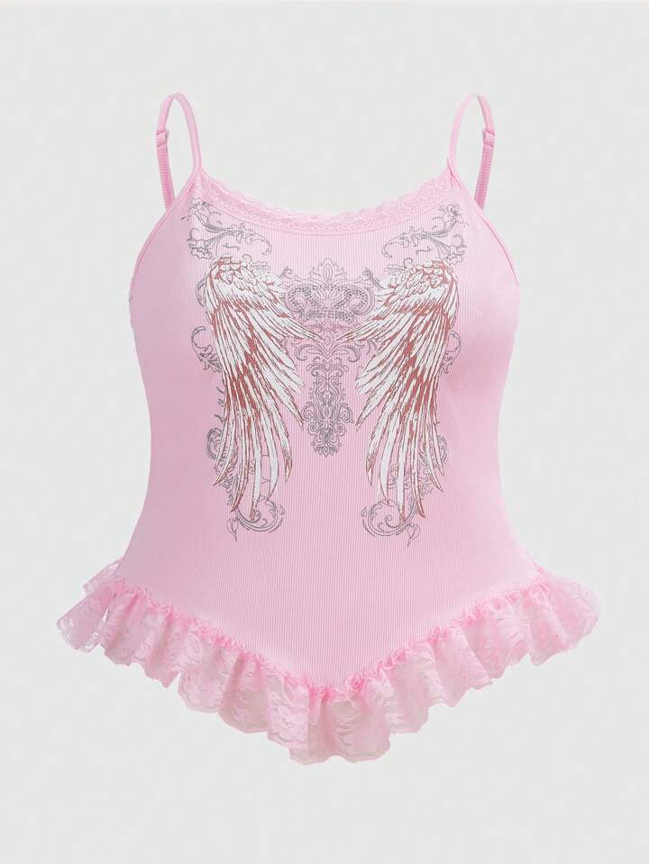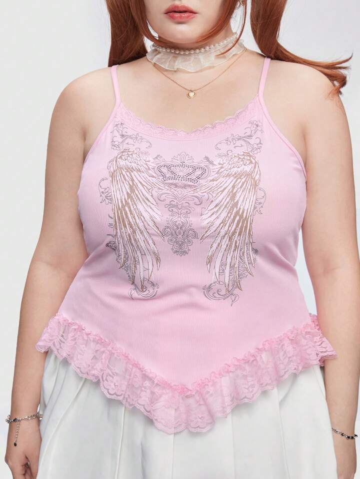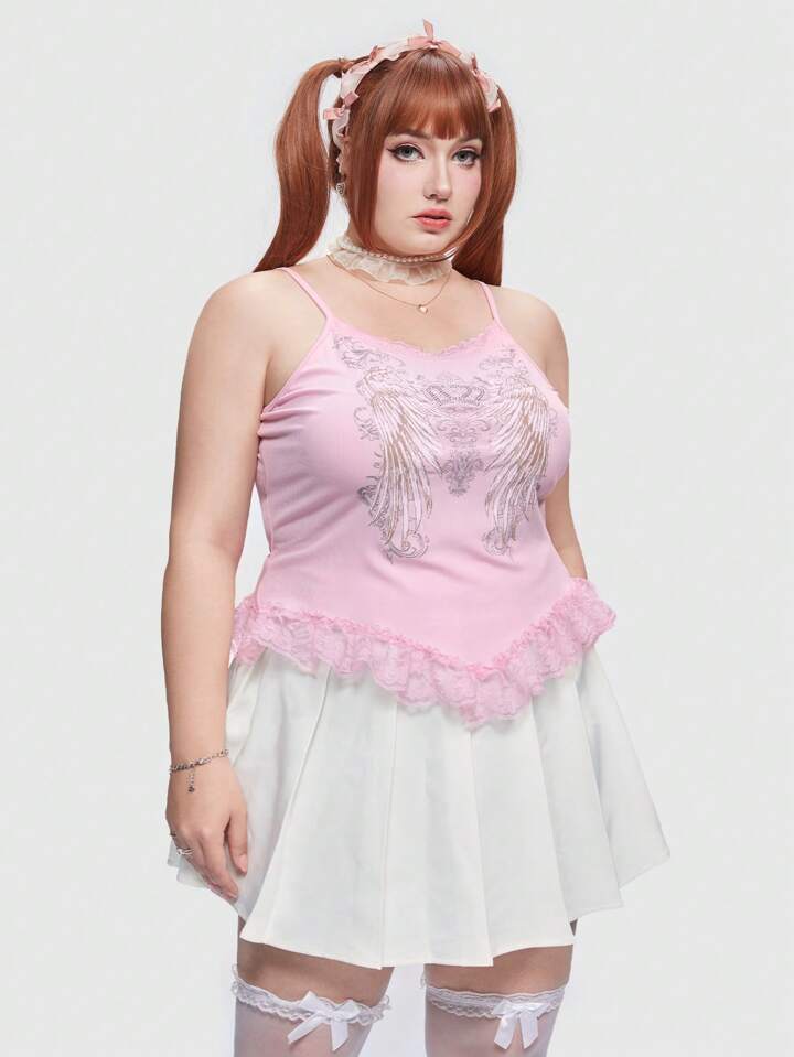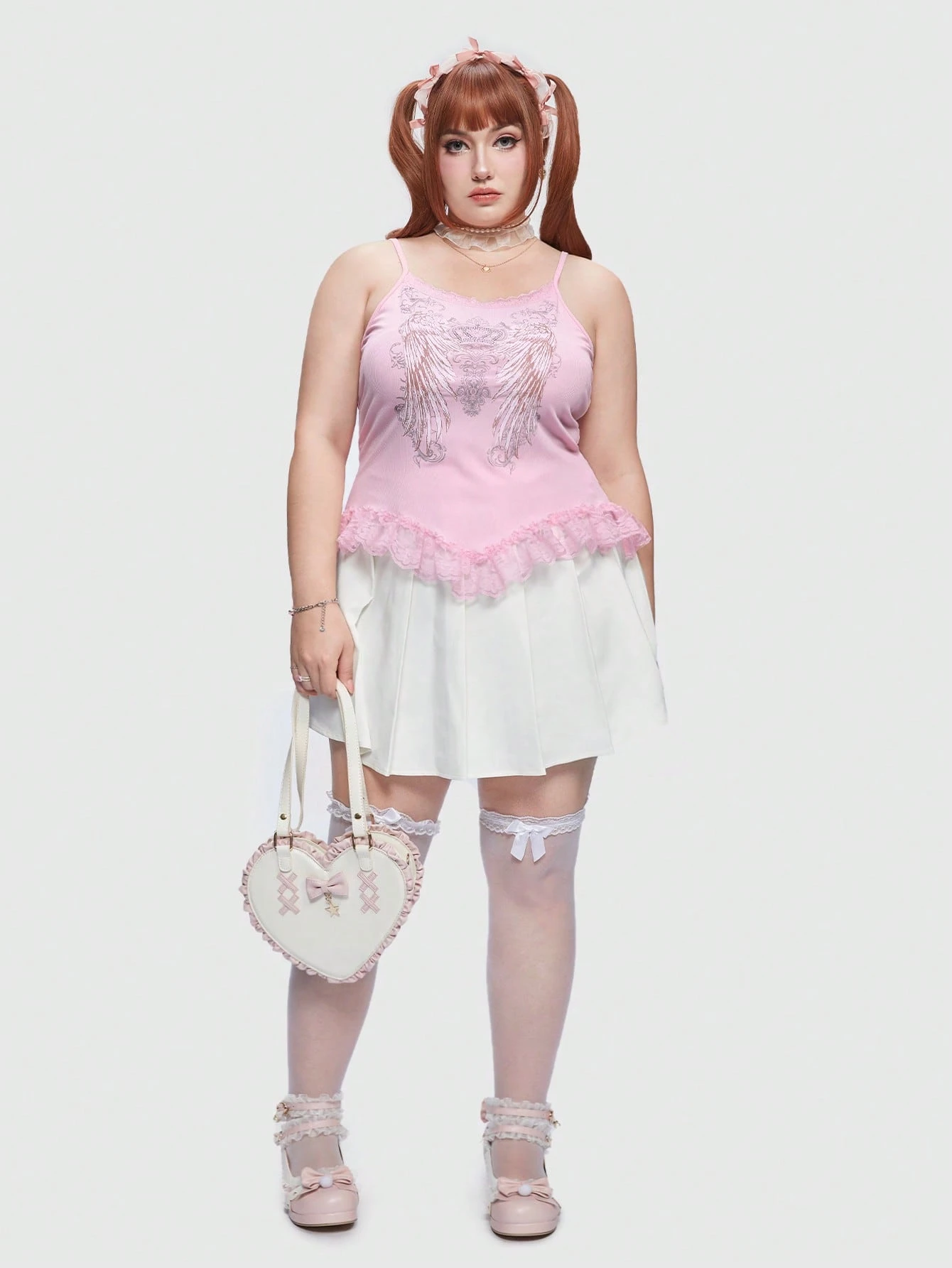 Kawaii Plus Crown & Wings Print Contrast Lace Cami Top