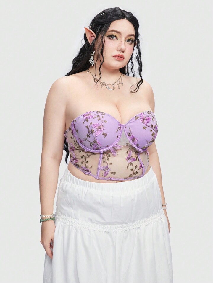 Kawaii Plus Floral Embroidery Bustier Mesh Tube Top