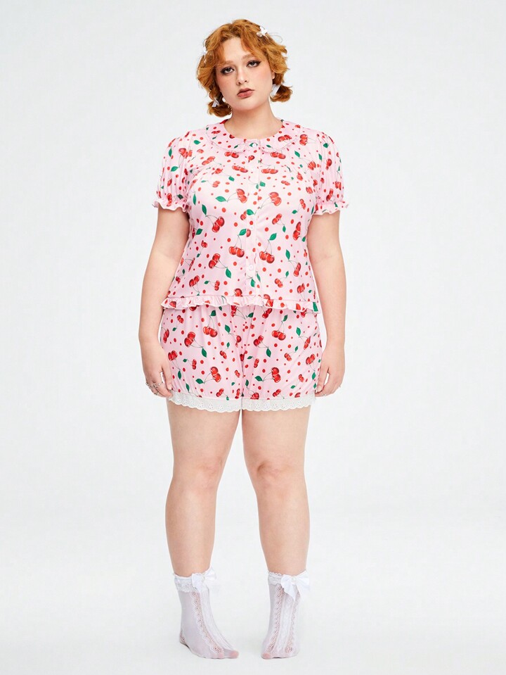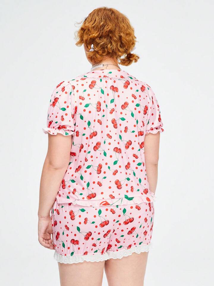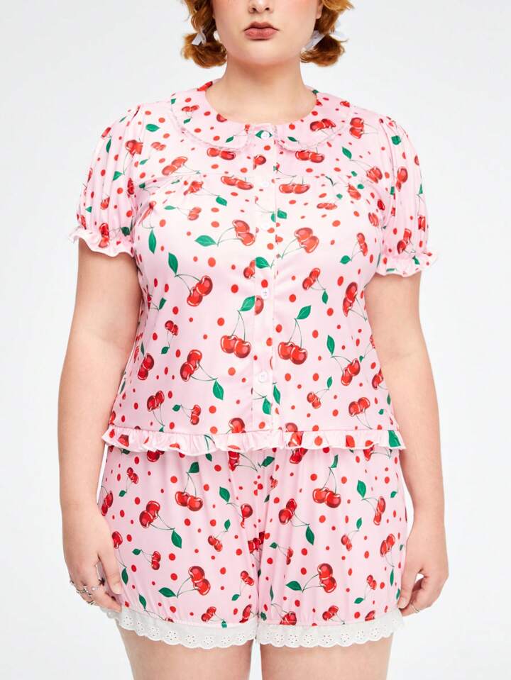 Kawaii Plus Size Cherry Print Collar Turn-Down Neckline Puff Sleeve Comfortable Homewear Pajamas Set