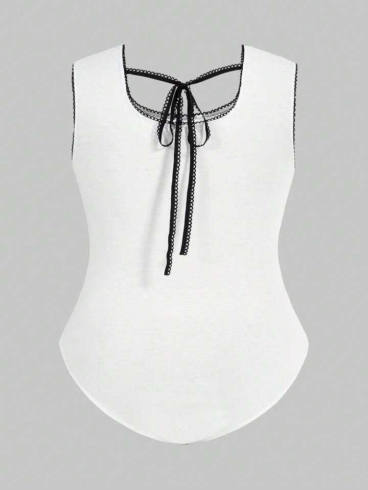 Kawaii Plus Size Color Block Lace Trimmed Lace-Up Bodysuit