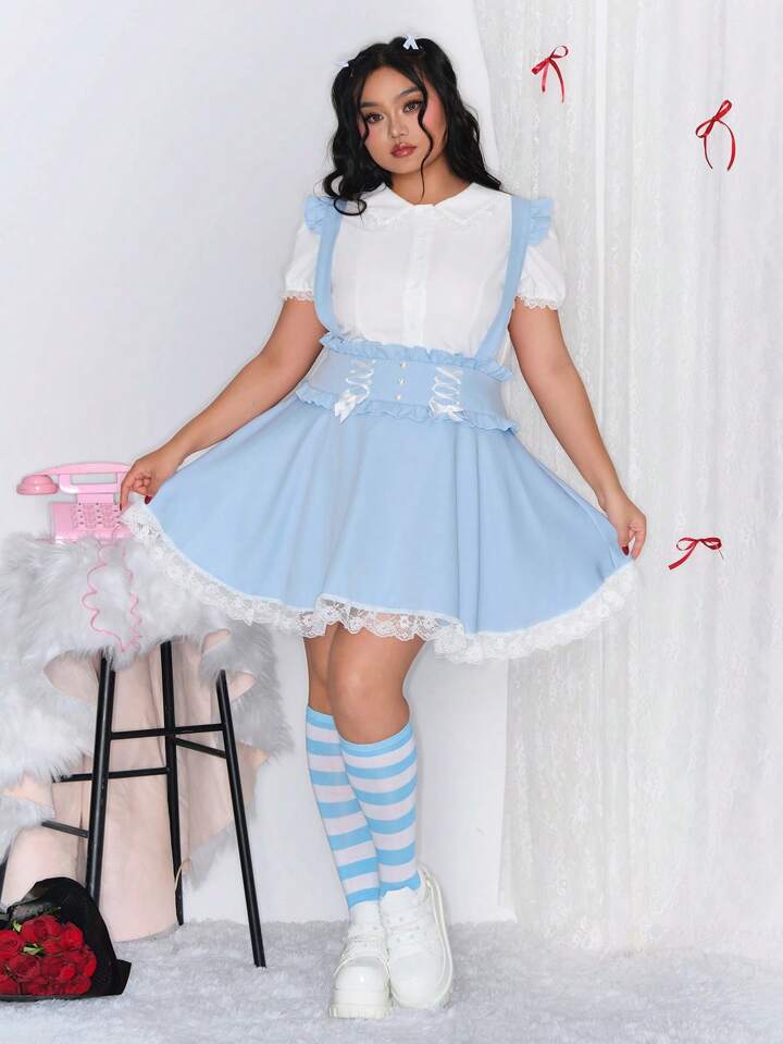 Kawaii Plus Size Lace Patchwork Floral Trim Casual Skirt, Suitable For Vacation