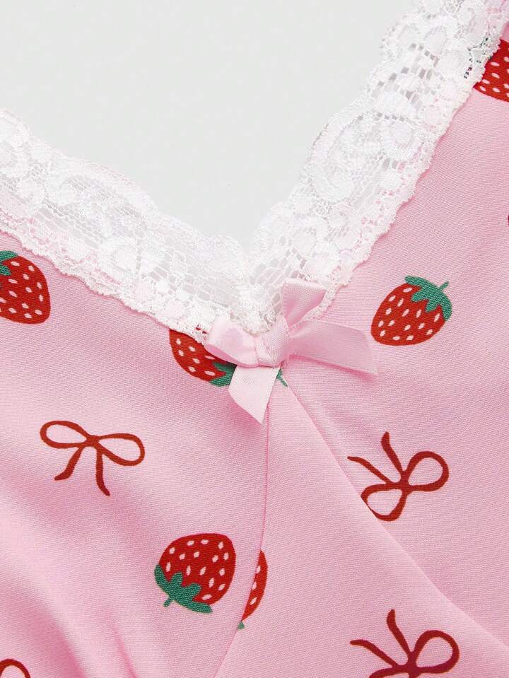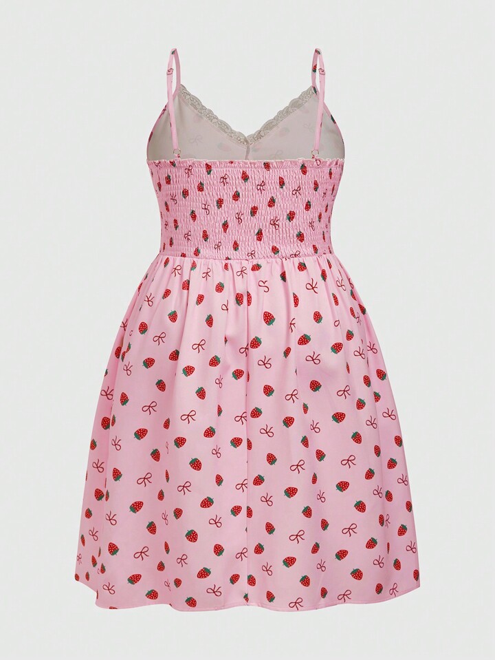 Kawaii Plus Size Strawberry Print Lace Trimmed Cami Dress With Bowknot