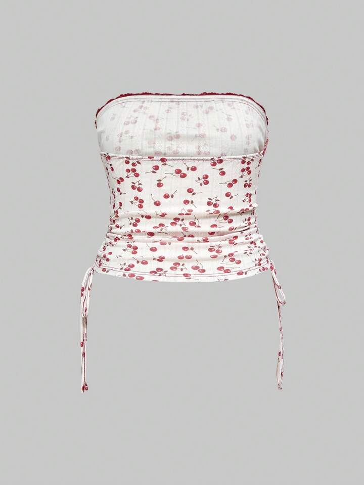 Kawaii Plus Size Women Cherry Print Floral Ruffle Bow Camisole Top