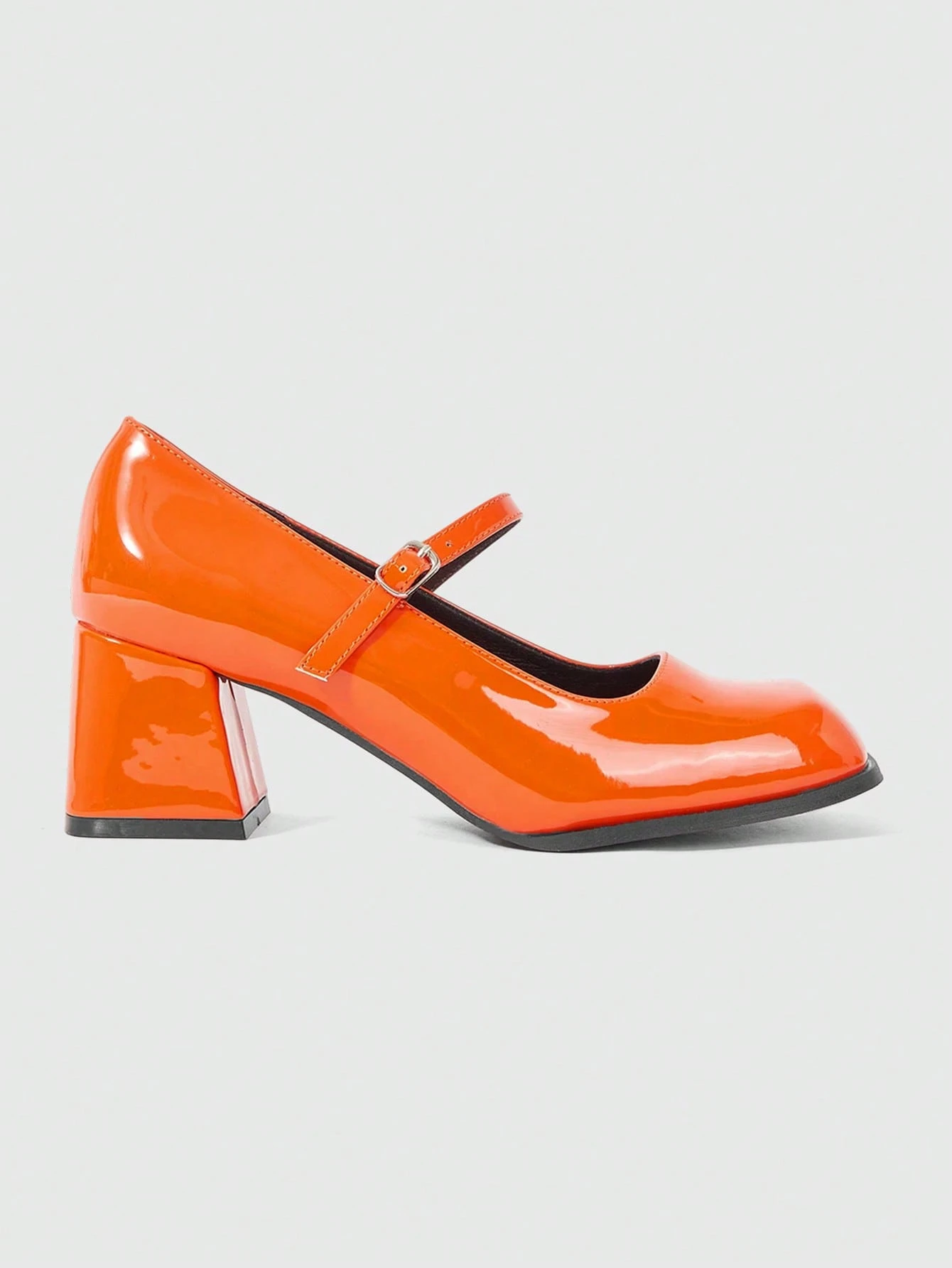 Kawaii Plus Size Women Orange Square Toe Strap Thick Heeled Mary Jane Pumps
