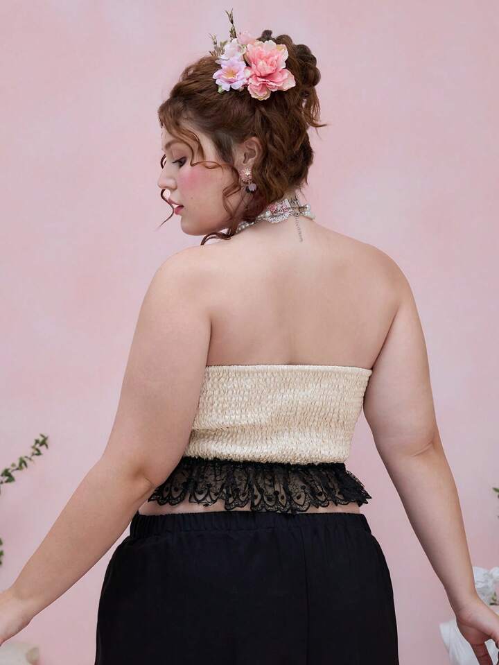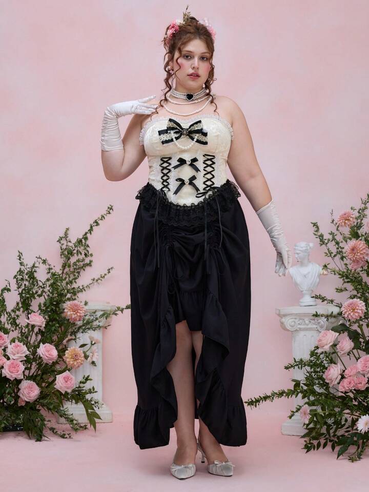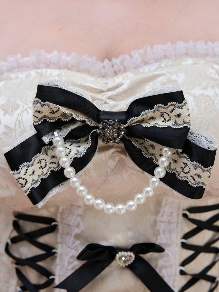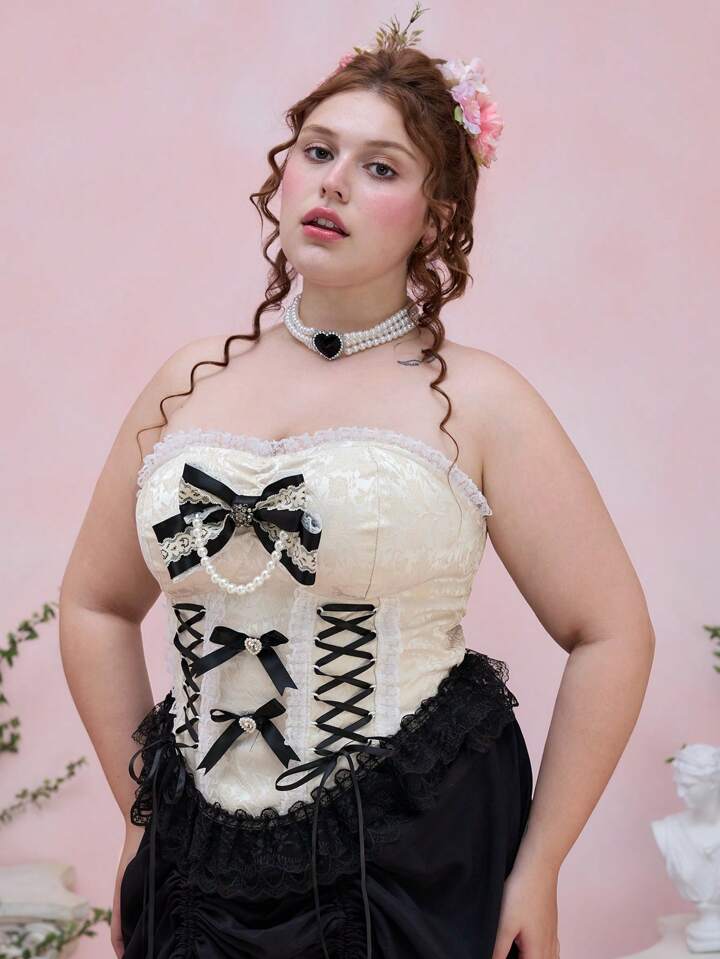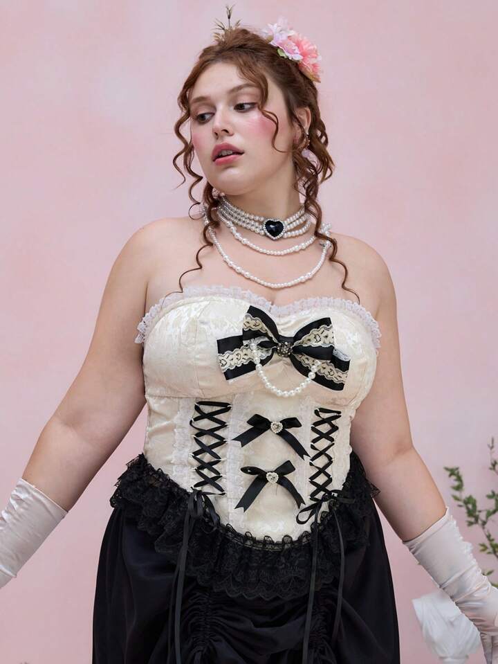 Kawaii Plus Size Women Retro Palace Style Romantic Pearl Bow Ribbon Decorated Bustier Top