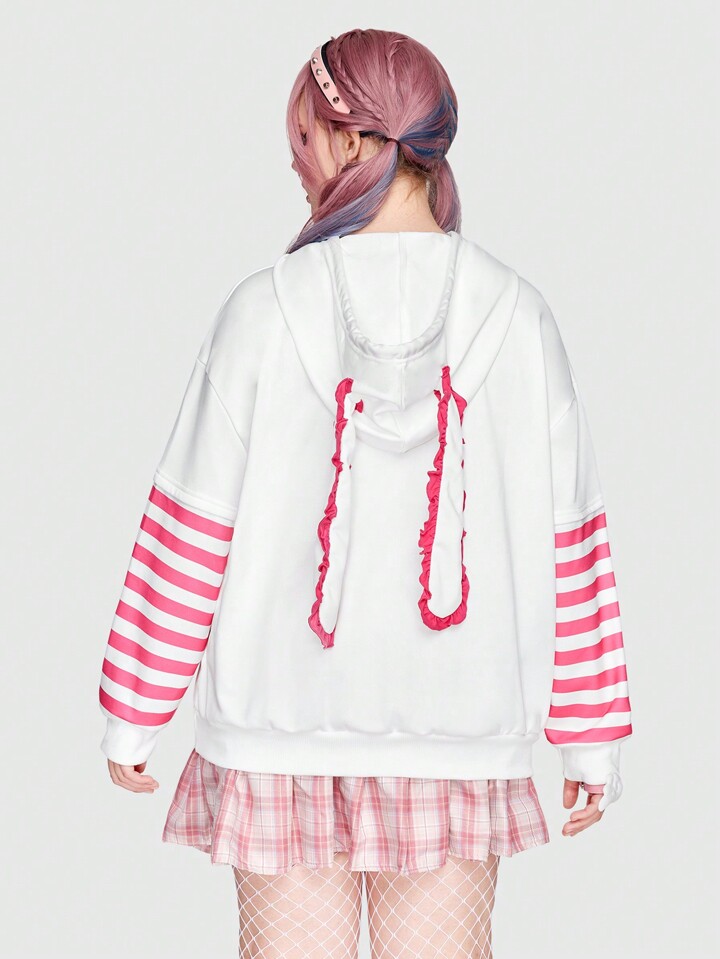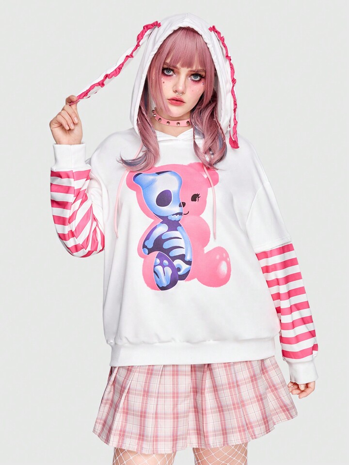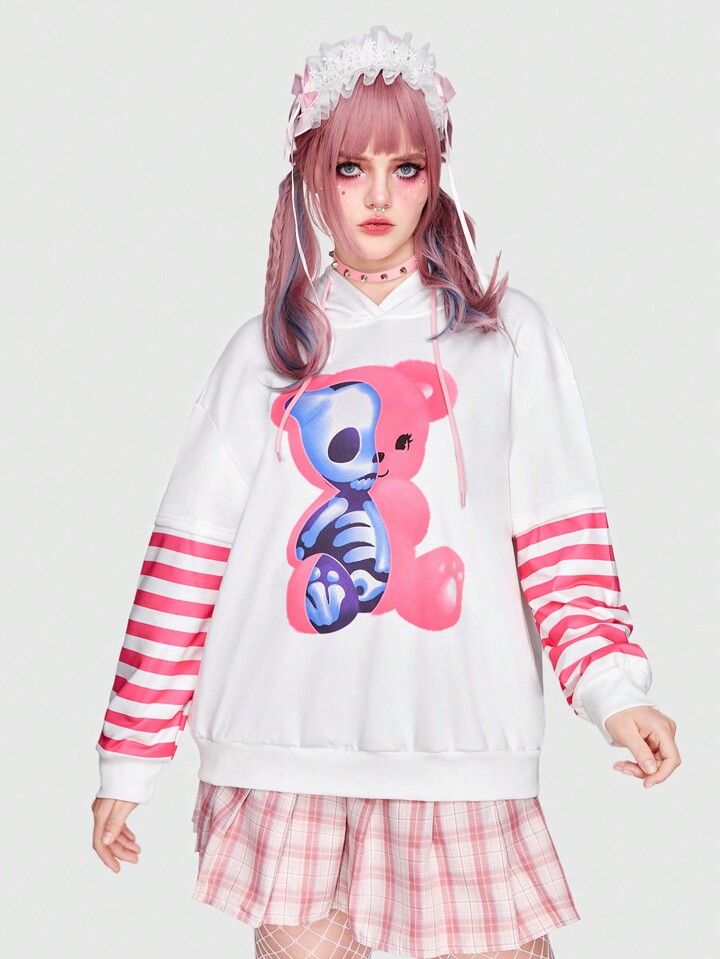 Kawaii Plus Striped & Bear Print Drop Shoulder Hoodie