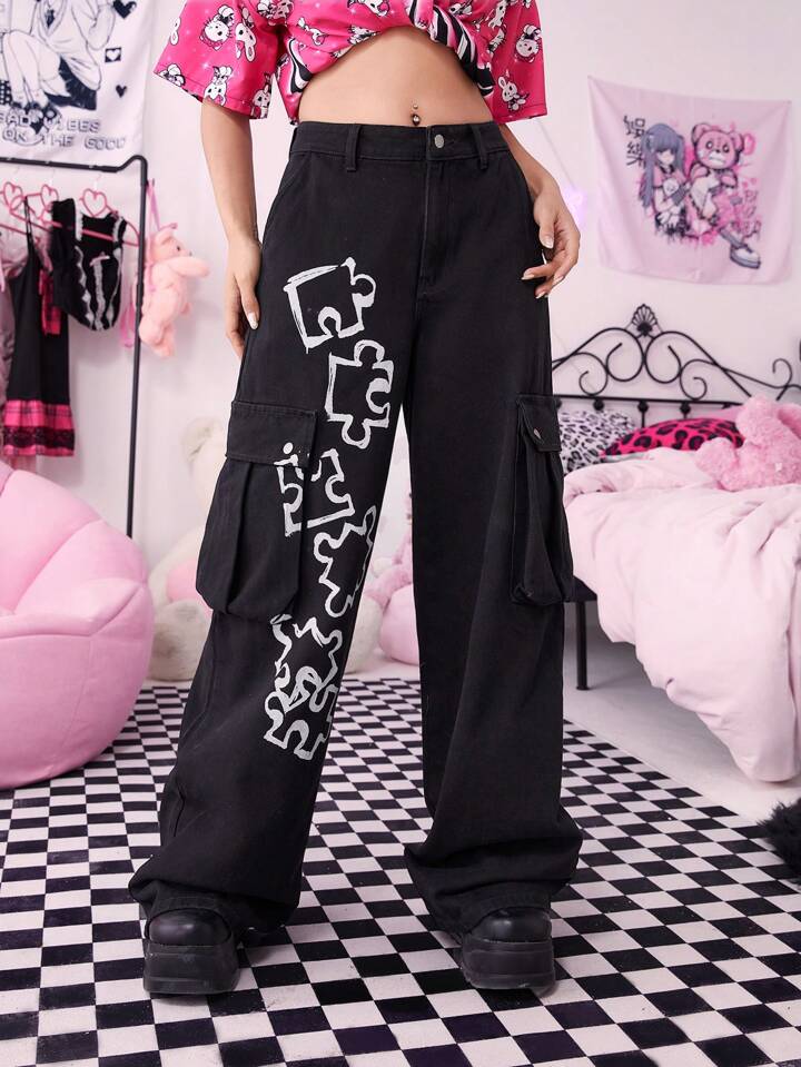 Kawaii Puzzle Graphic Flap Pocket Cargo Pants