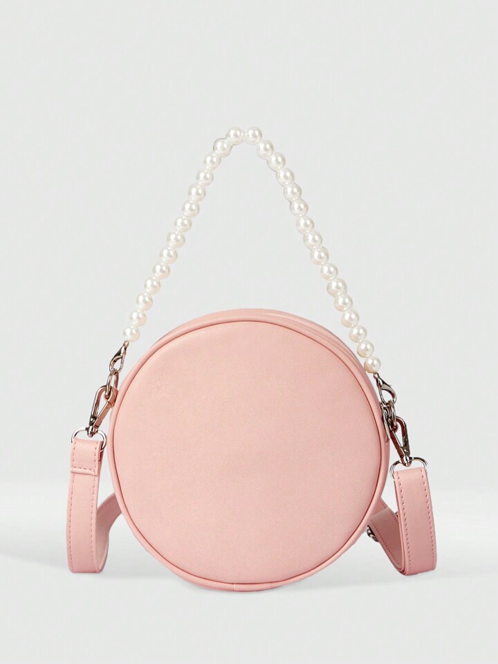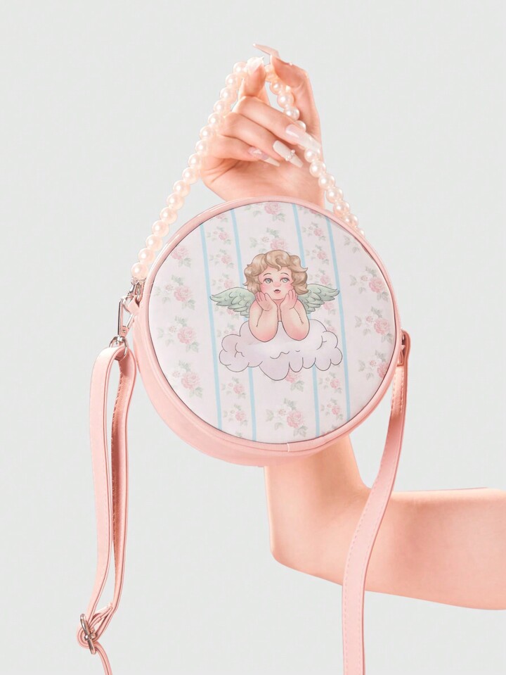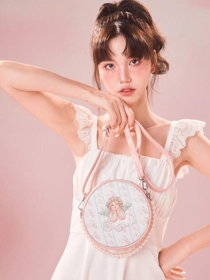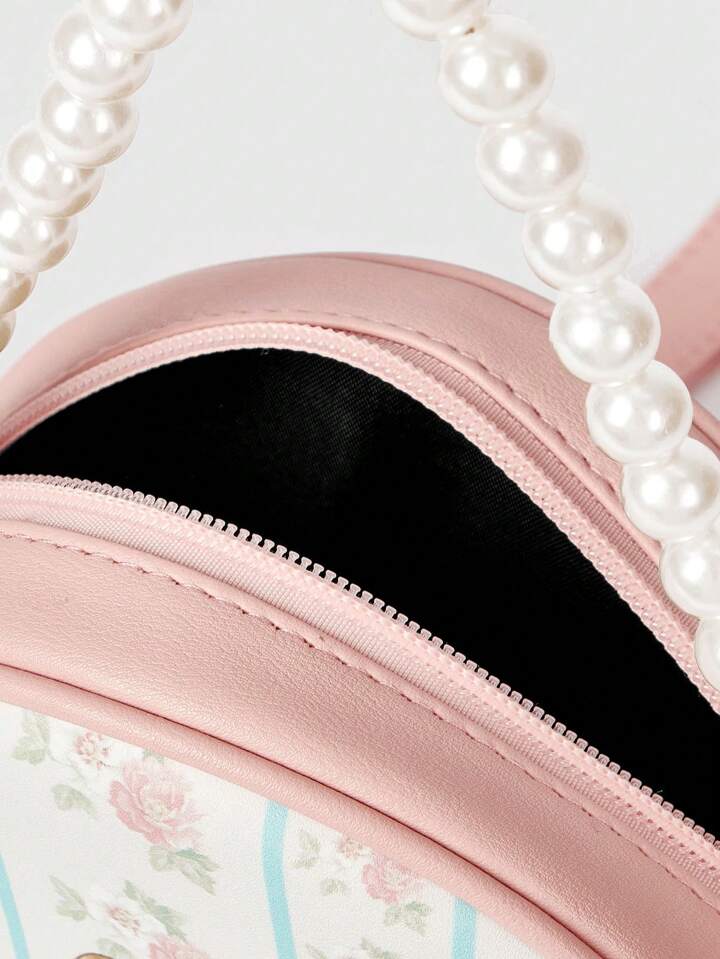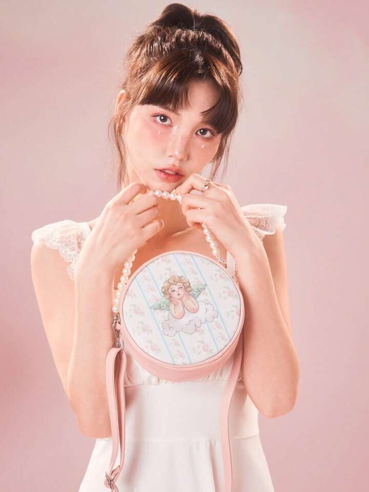 Kawaii Retro Cute Pearl Decor Print Round Sling Bag For Women