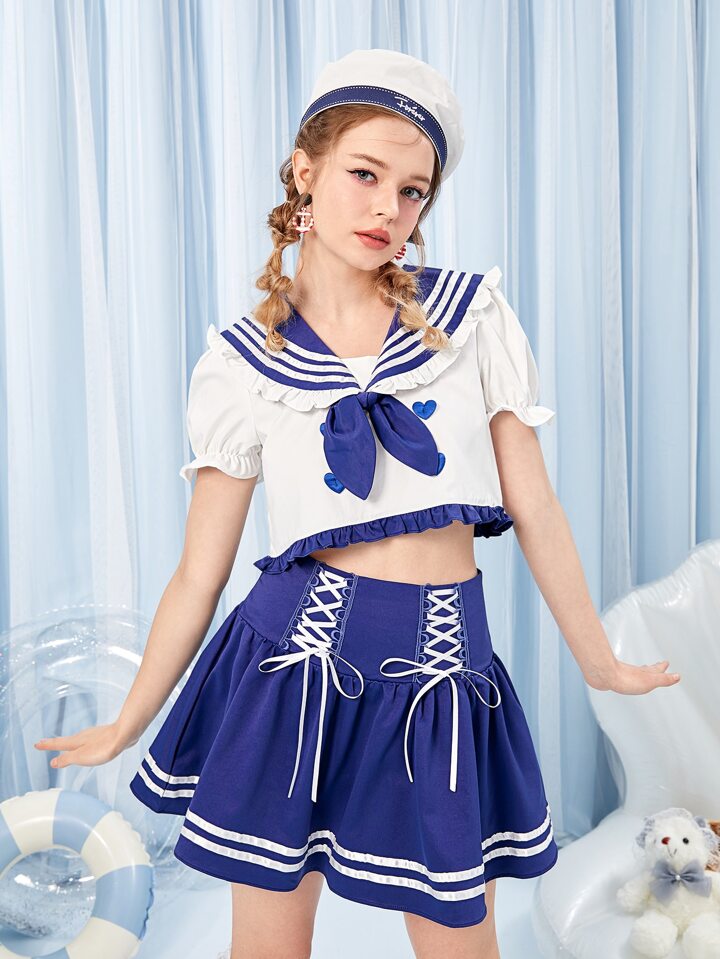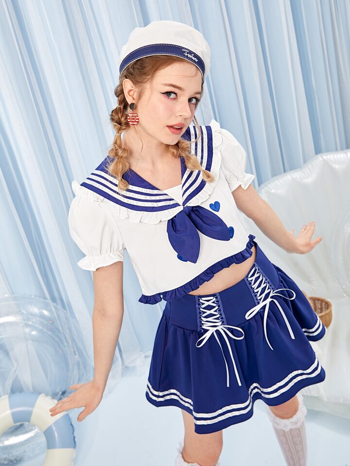 Kawaii Sailor Collar Bow Front Puff Sleeve Blouse
