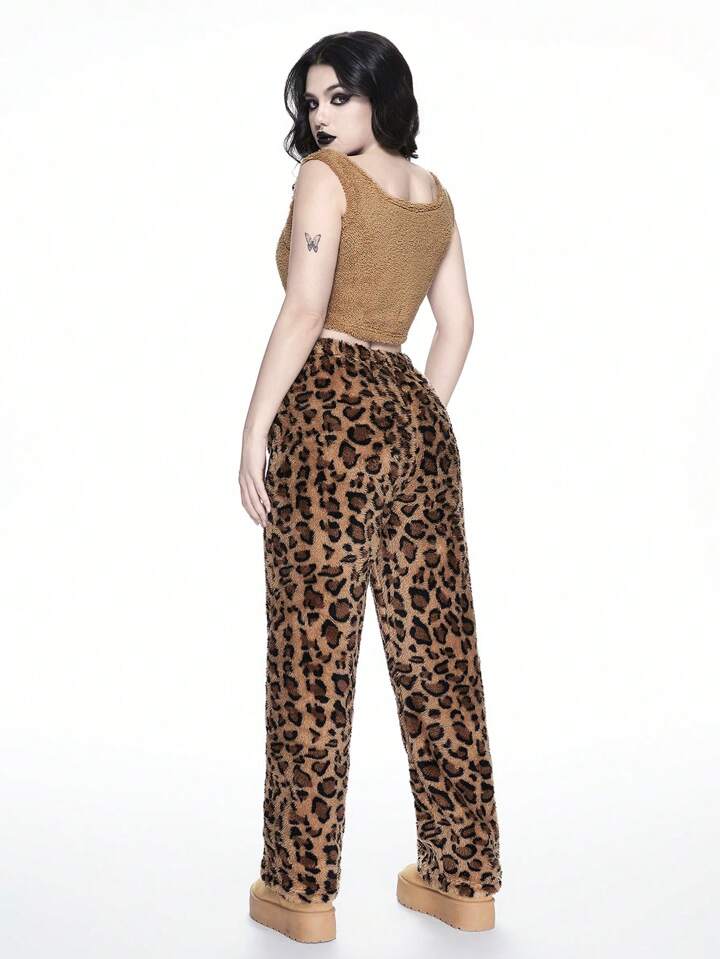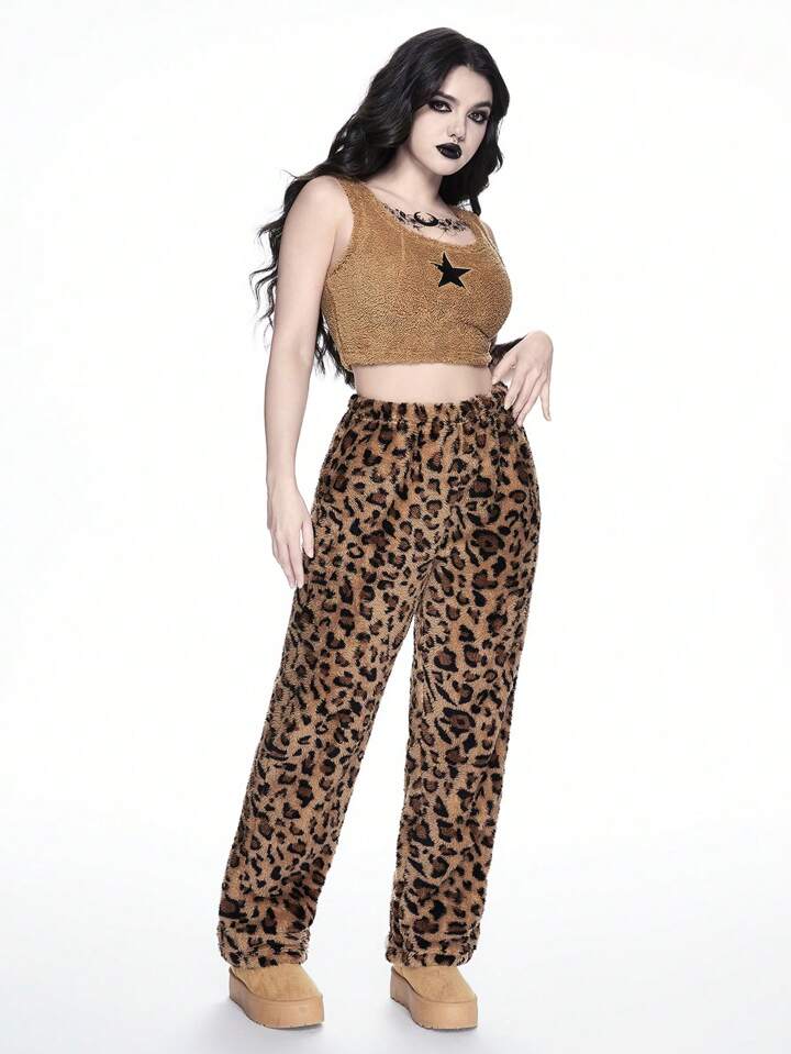 Kawaii Shibuya Coral Fleece Five-Pointed Star Embroidery Leopard Print Ankle-Tied Casual Sleepwear Suit