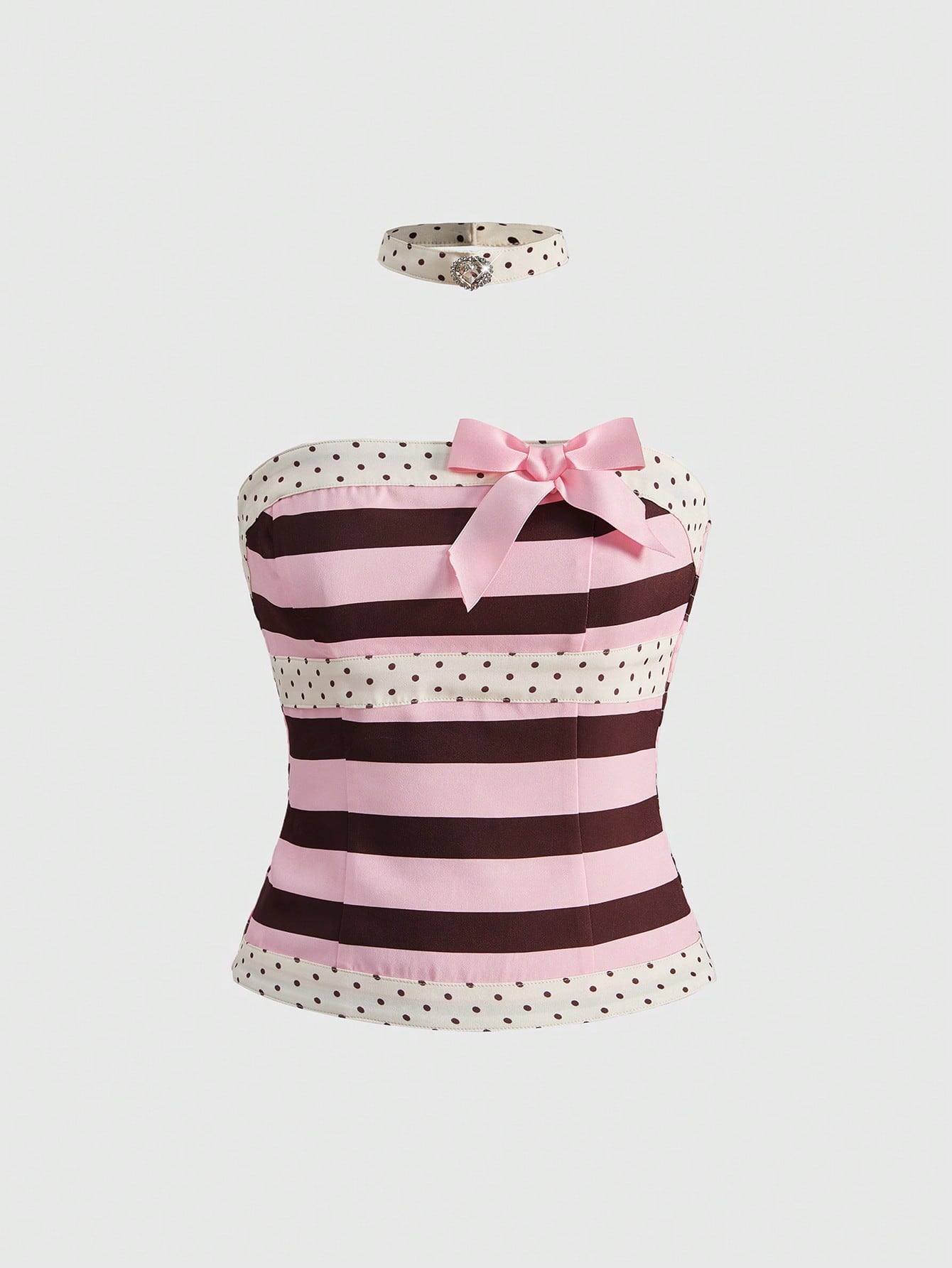 Kawaii Spring/Summer Valentine's Day Women's Elegant Colorblock Striped Polka Dot Print Bow Decor Tube Top, Summer