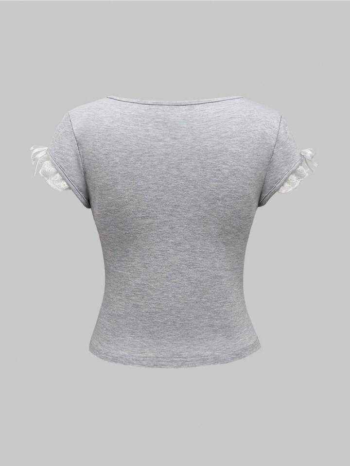 Kawaii Square Neck Contrast Lace Himekaji Ballet Style Color Blocking Short Sleeve T-Shirt For Women