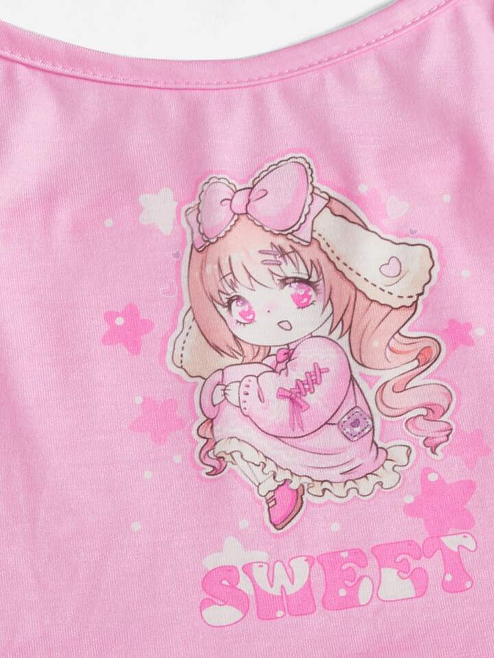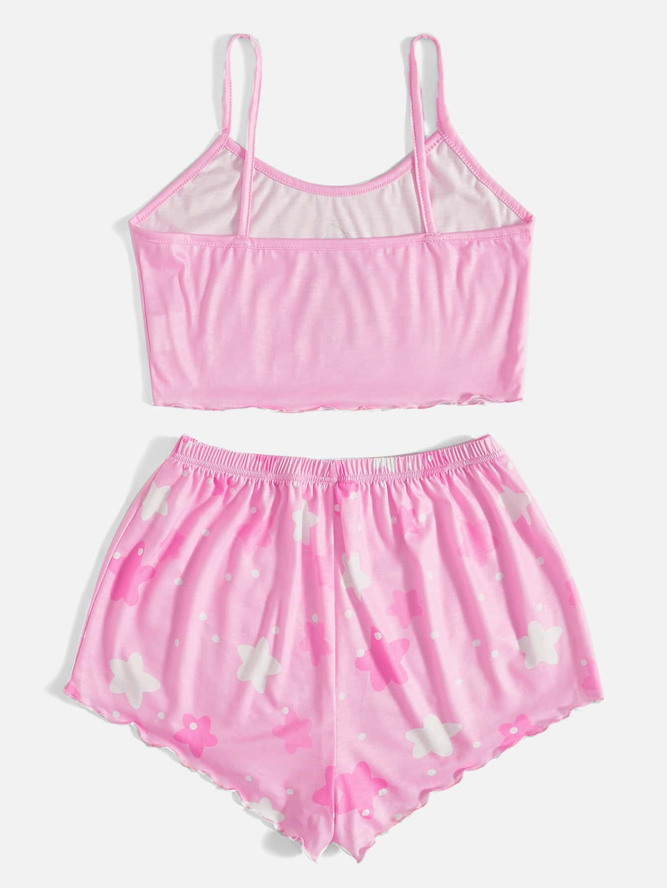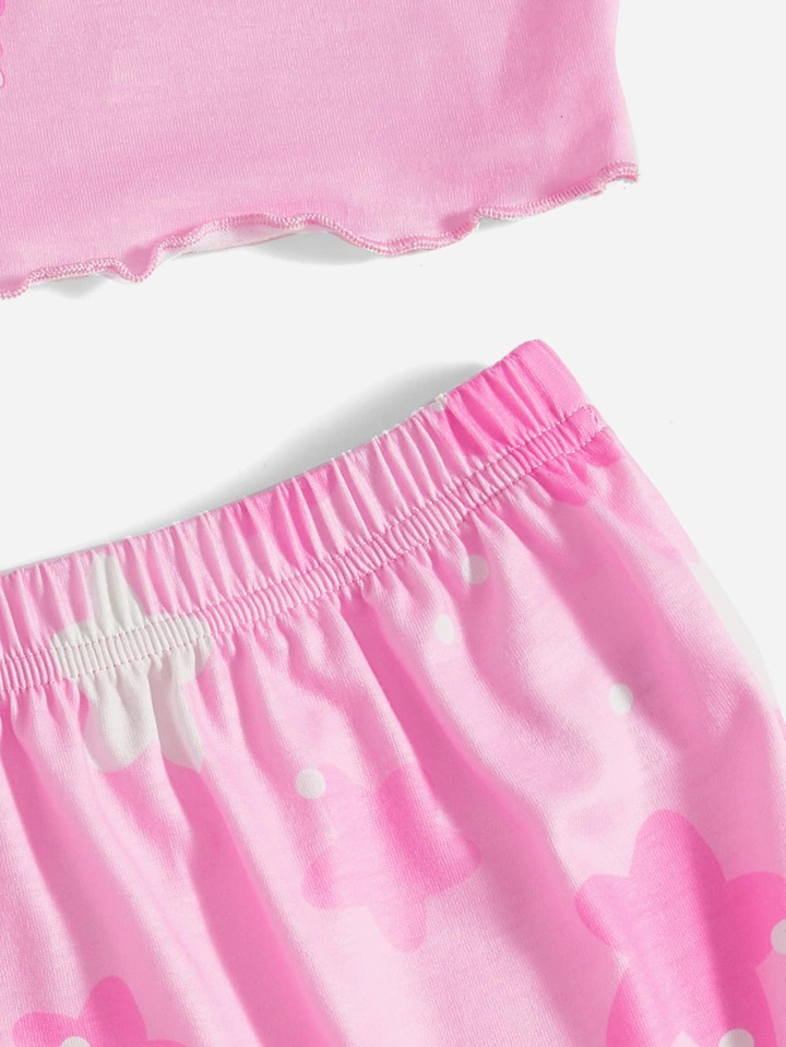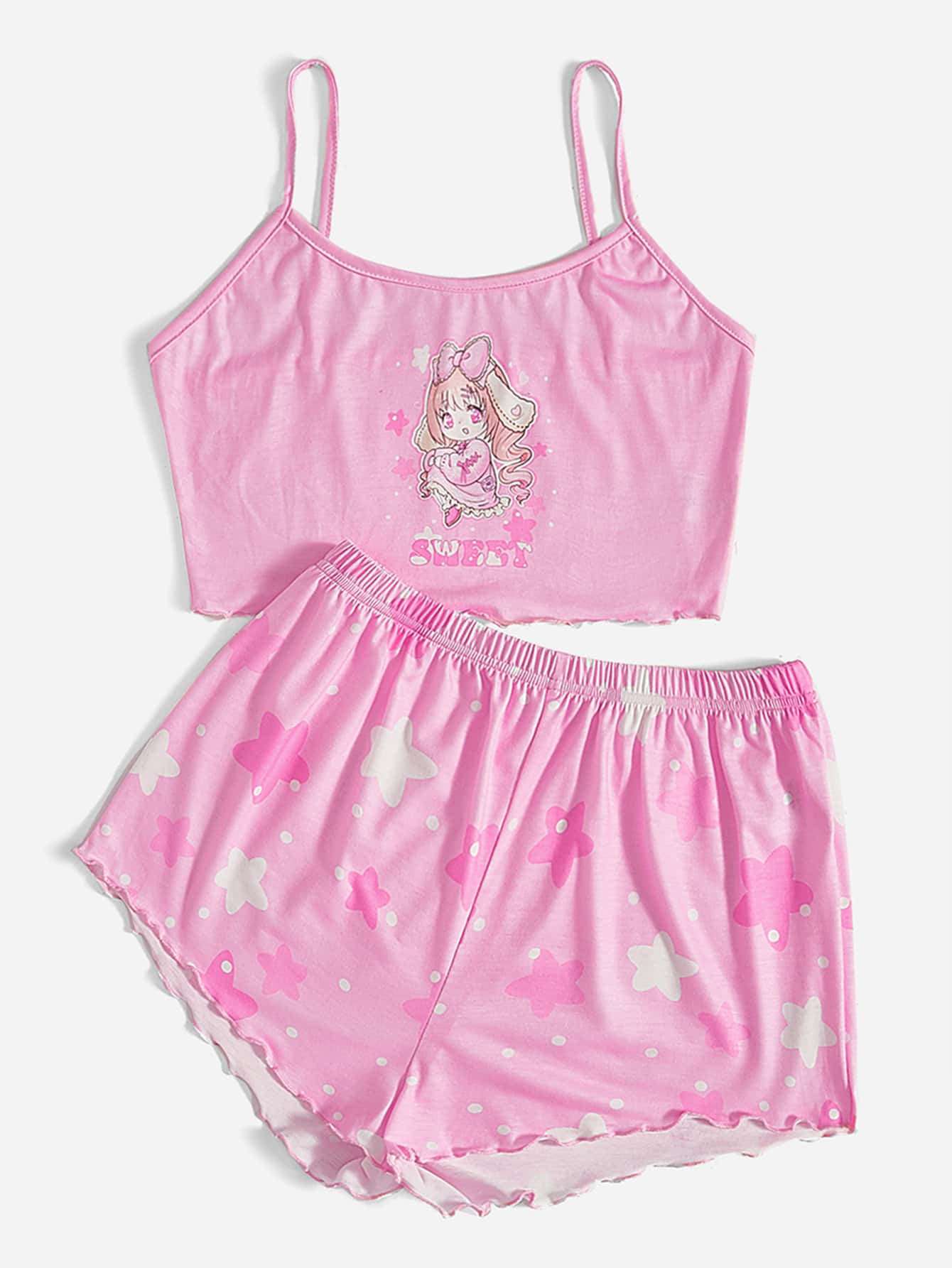 Kawaii Star & Figure Graphic Lettuce Trim PJ Set