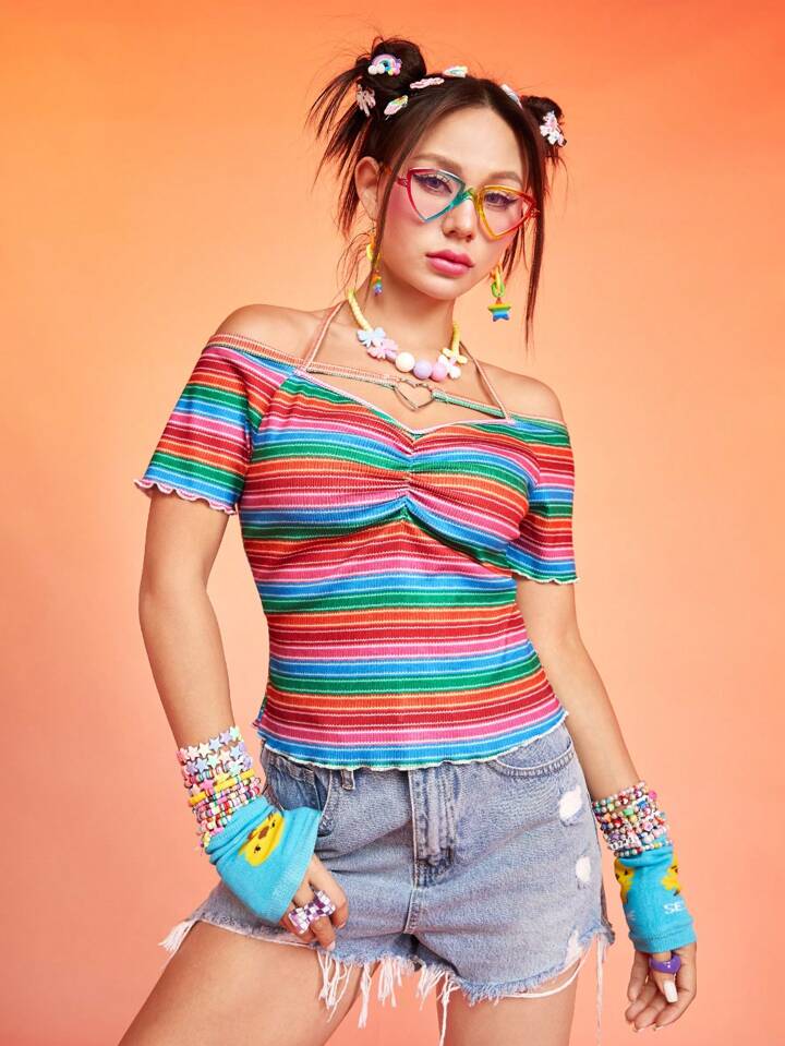 Kawaii Striped Heart Ring Linked Ruched Tee