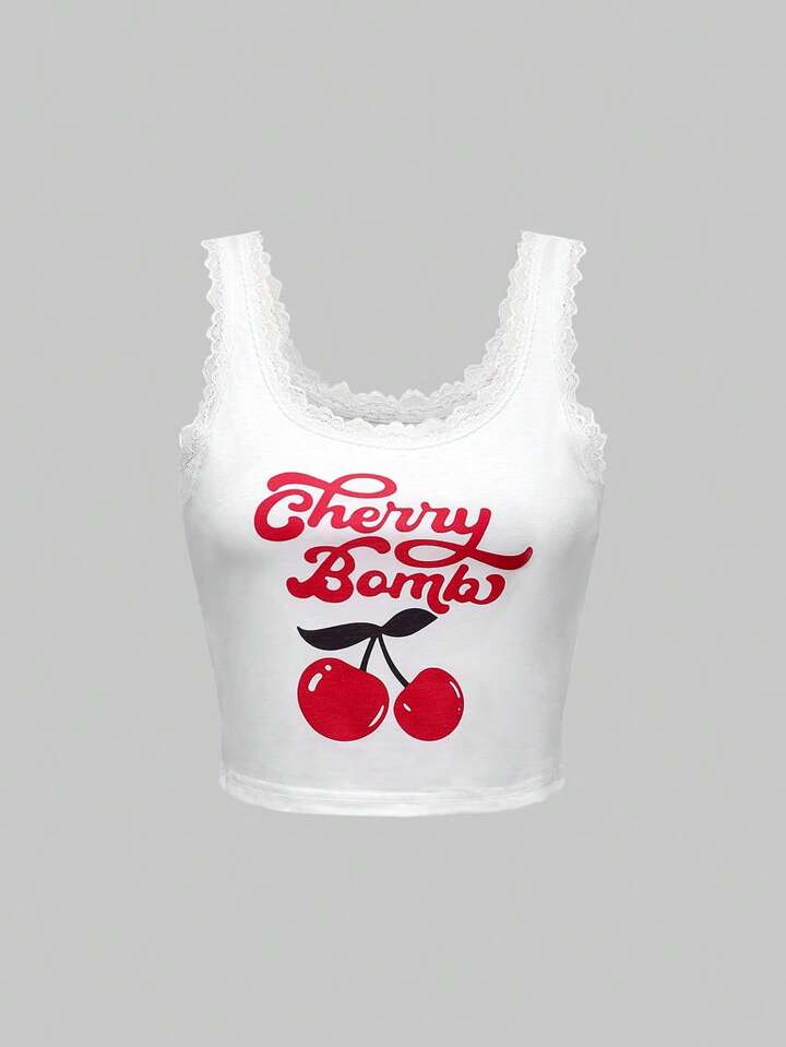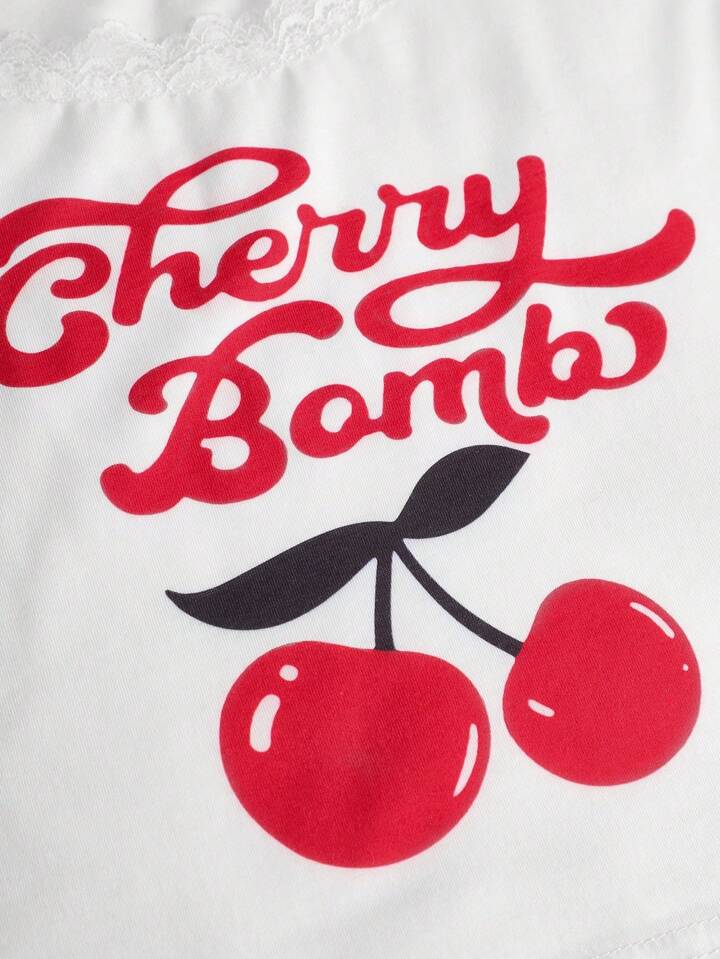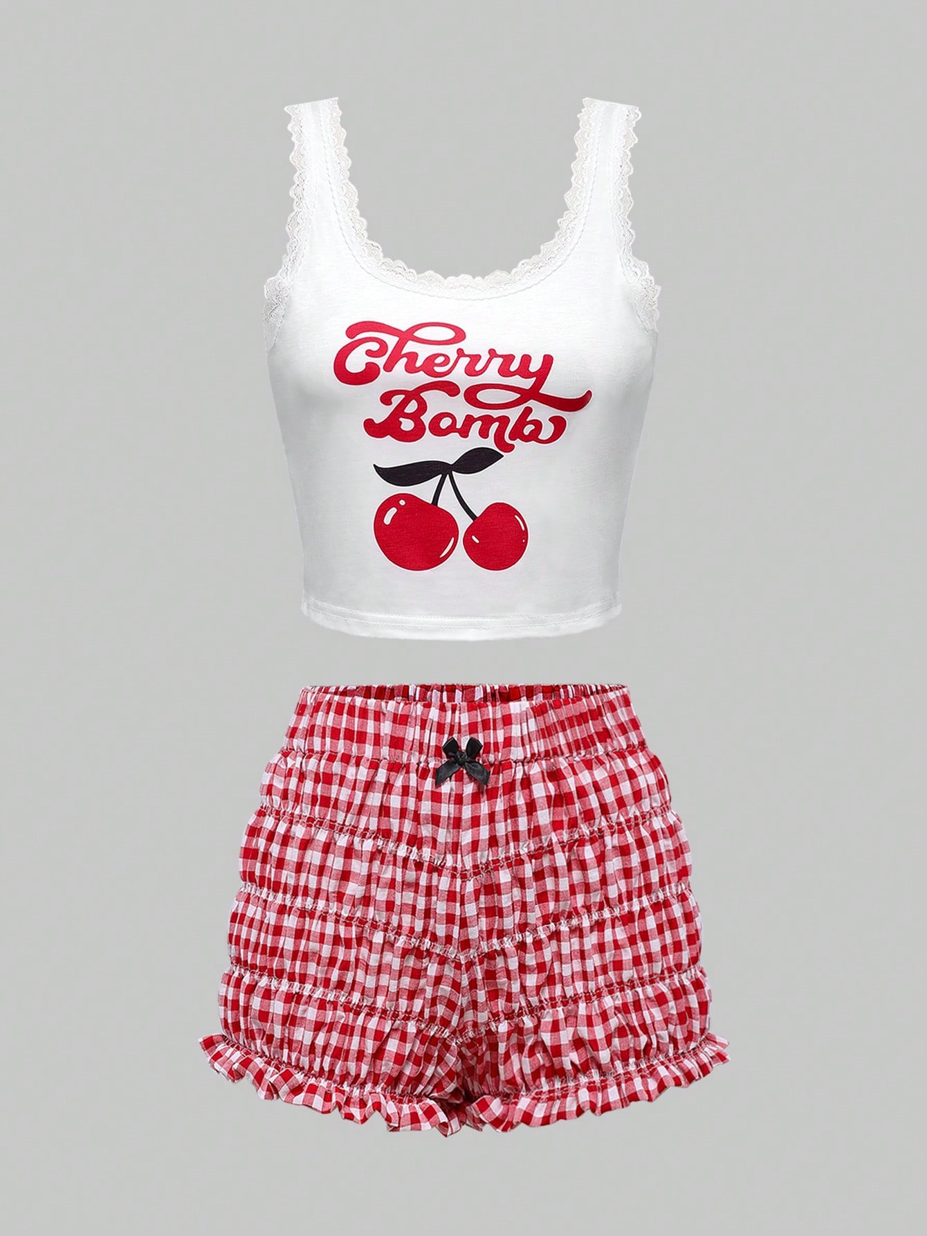 Kawaii Summer Retro Cherry Plaid Print Lace Patchwork Ruffle Puff Shorts Camisole Casual Pajamas Set