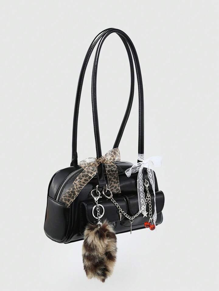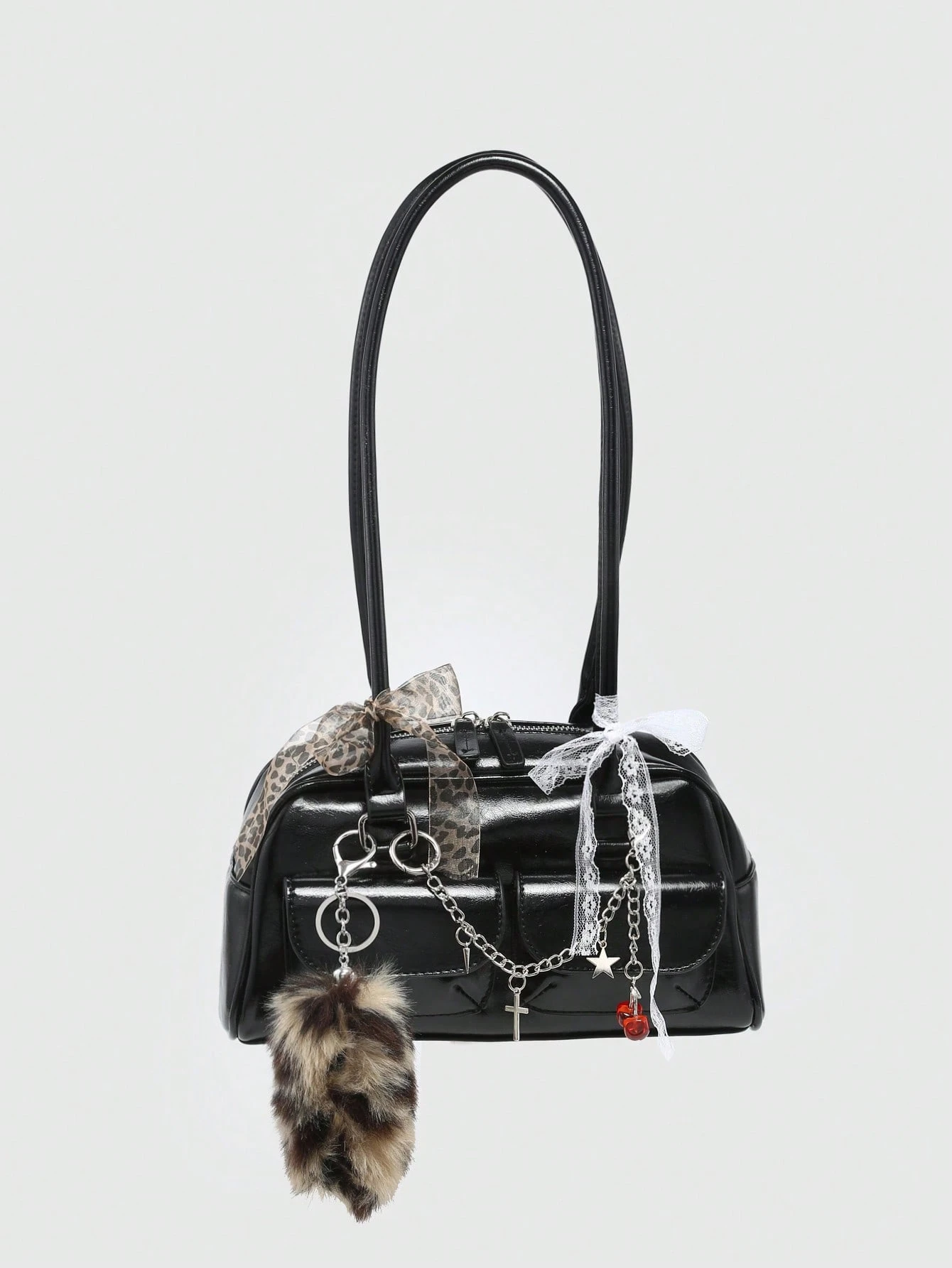 Kawaii Vintage Inspired Women's Plaid Bowknot Strap Cherry & Heart Accent Shoulder Underarm Bag With Multi-Pockets Boston Style