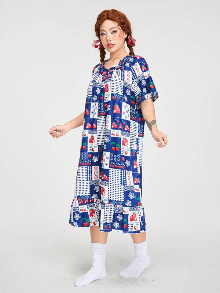 Kawaii Vintage Style Family Time Strawberry Print Patchwork House Dress