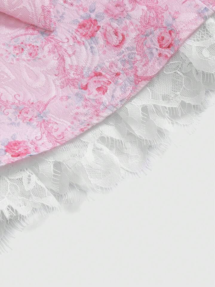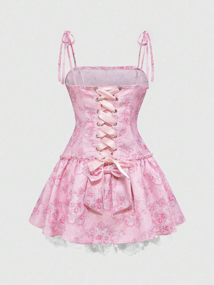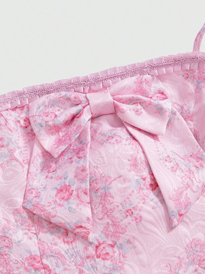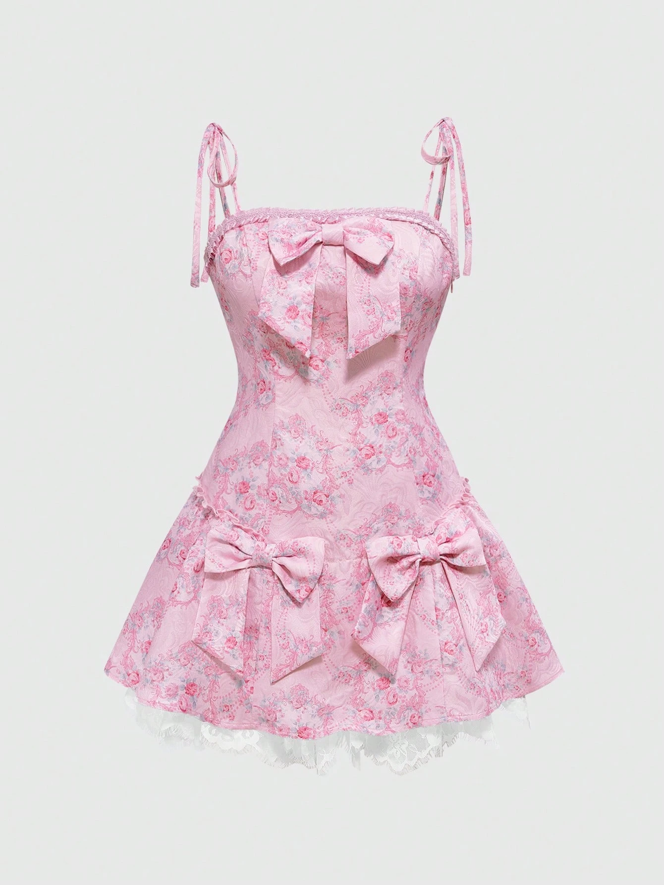 Kawaii Vintage Sweet Floral & Bow Decor Shirred Mini Dress For Women, Harajuku Style