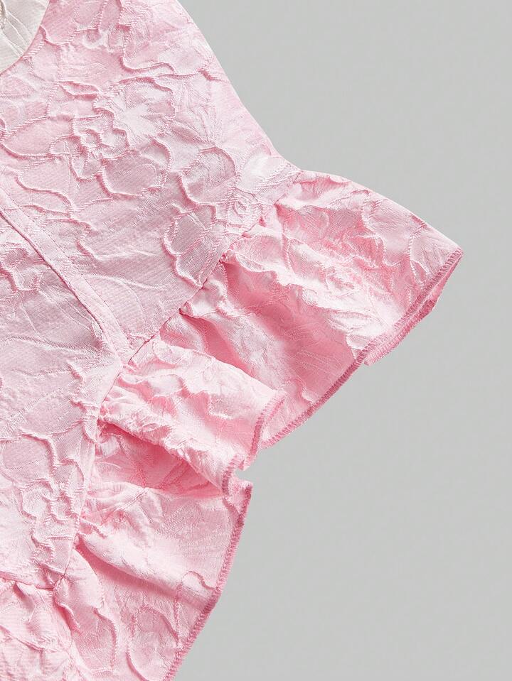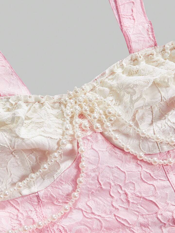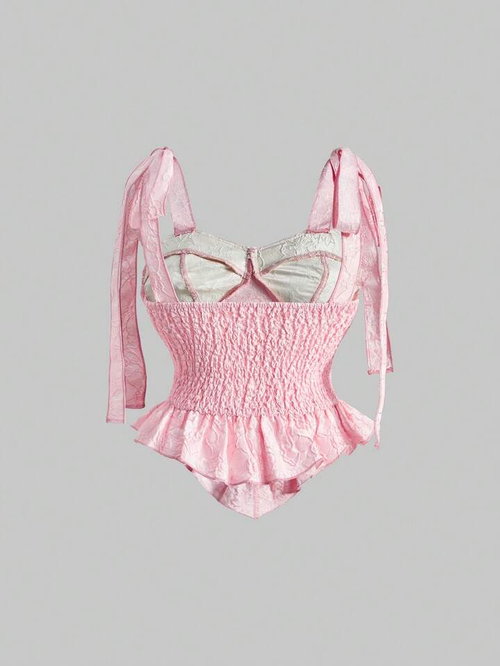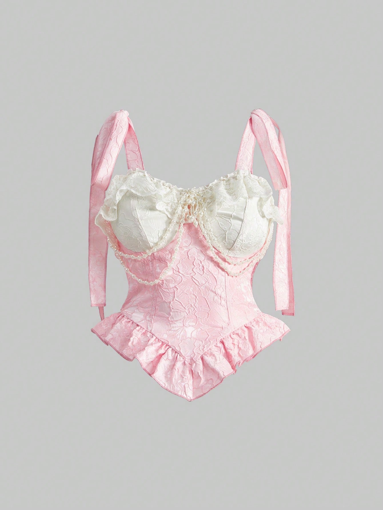Kawaii Vintage Victorian Lace Satin Pearl Brooch Decor Tie Front Blouse For Women, Puff Pink