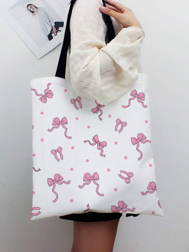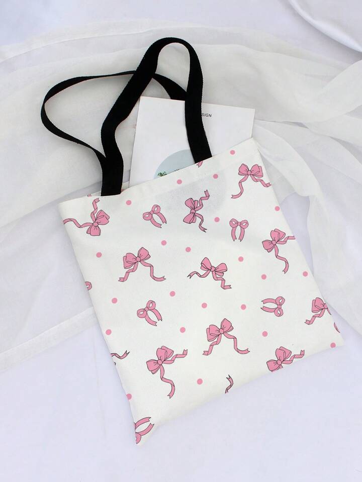 Kawaii White Base Double-Sided Printed Canvas Shoulder Bag With Bow Pattern
