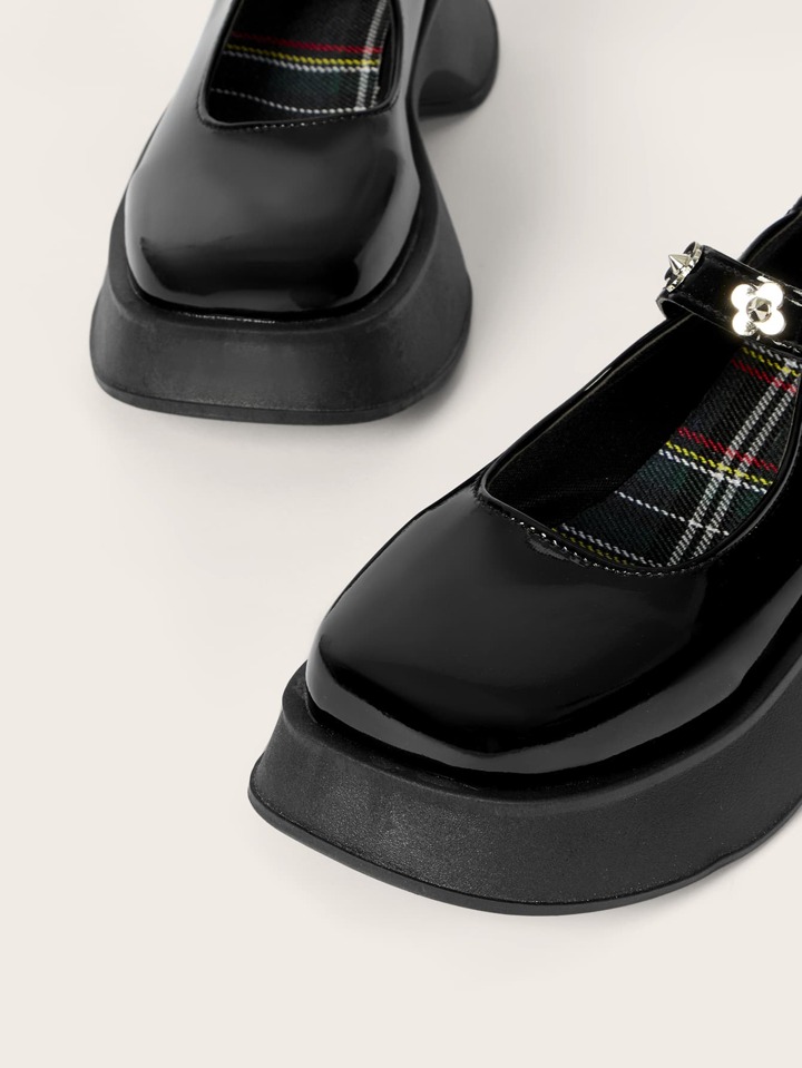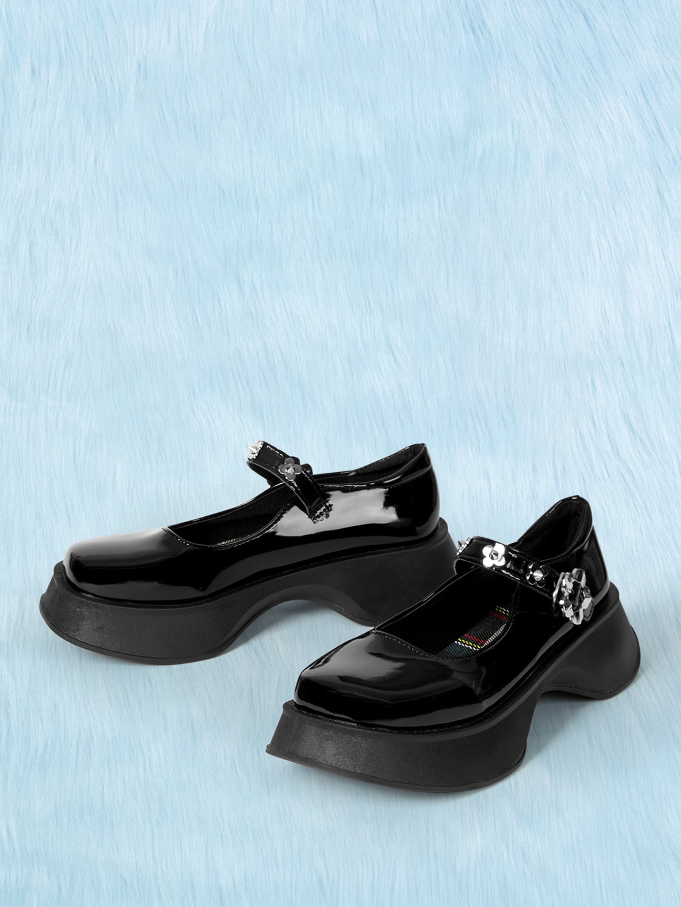 Kawaii Women Appliques Decor Flatform Shoes, Preppy Black Mary Jane Shoes