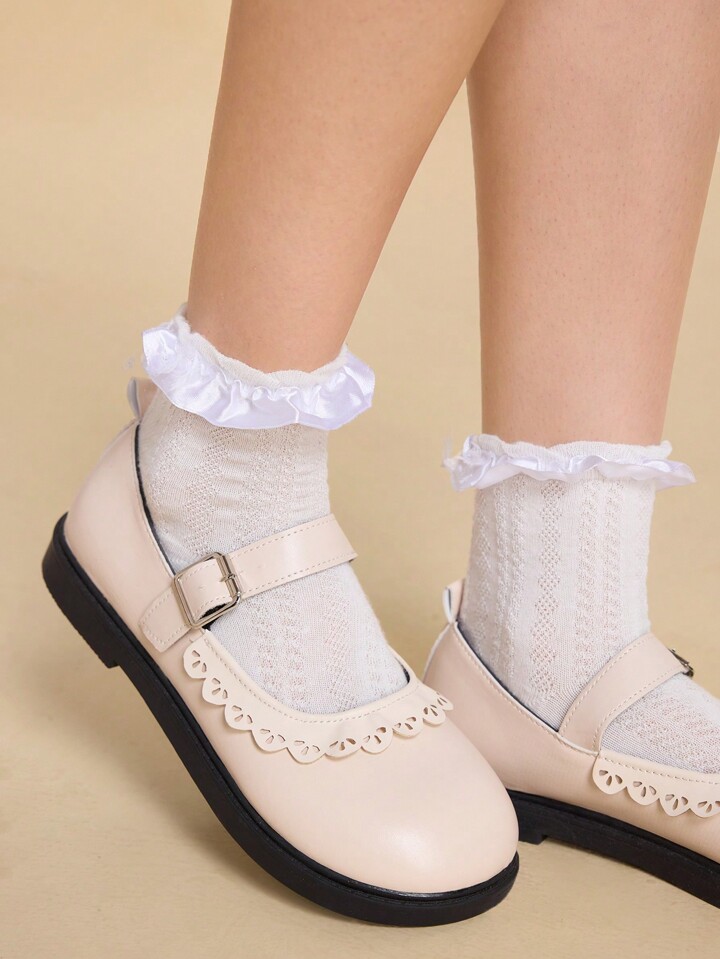 Kawaii Women Beige Round Toe 3cm Vintage British Sweet Ruffle Mary Jane Flat Casual PU Leather Shoes, Versatile Japanese School Style